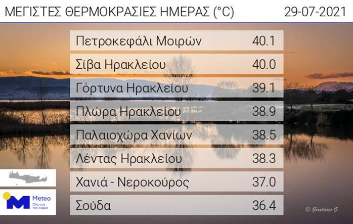 Σύμφωνα με τον Διευθυντή Ερευνών στο Εθνικό Αστεροσκοπείο Αθηνών, κ. Λαγουβάρδο, οι πολύ υψηλές θερμοκρασίες θα συνεχιστούν στην Κρήτη μέχρι τουλάχιστον τα μέσα της επόμενης εβδομάδας.