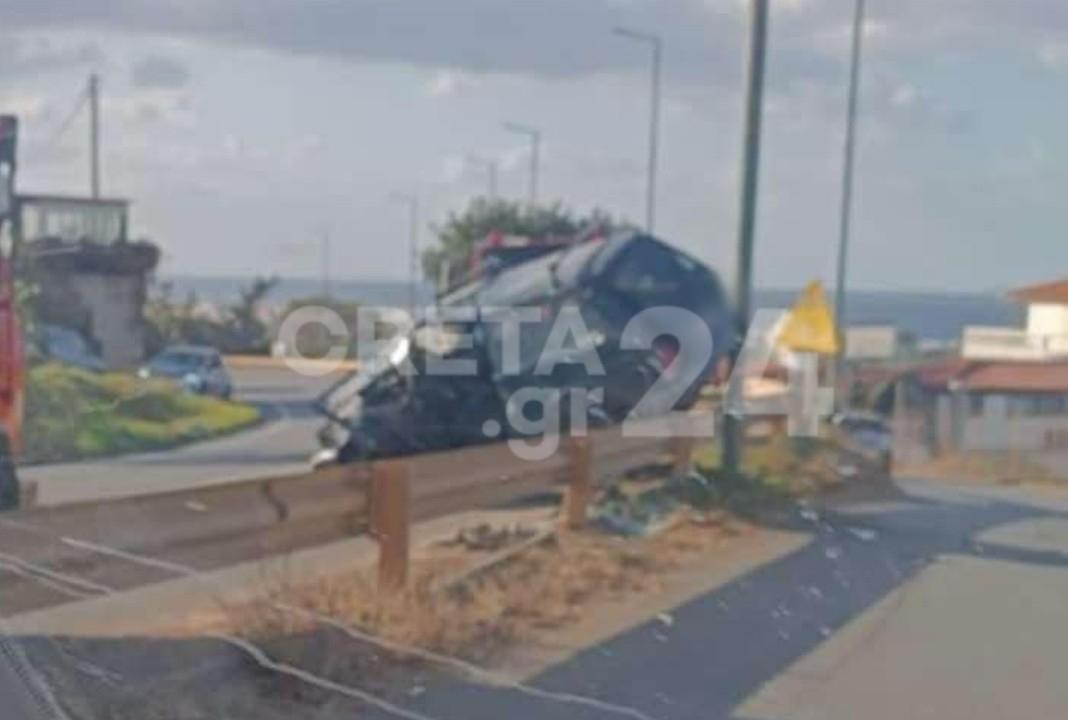 Από τη σφοδρότητα της σύγκρουσης, όπως φαίνεται στις εικόνες του Creta24 το ένα αυτοκίνητα ανέβηκε στο διαχωριστικό στηθαίο.