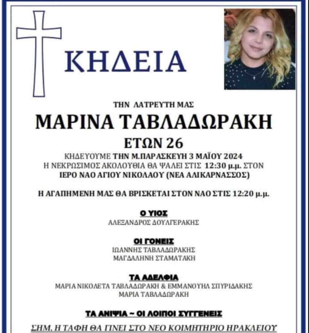 Θλίψη σκόρπισε στο Ηράκλειο η είδηση του θανάτου της 26χρονης Μαρίνας Ταβλαδωράκη.