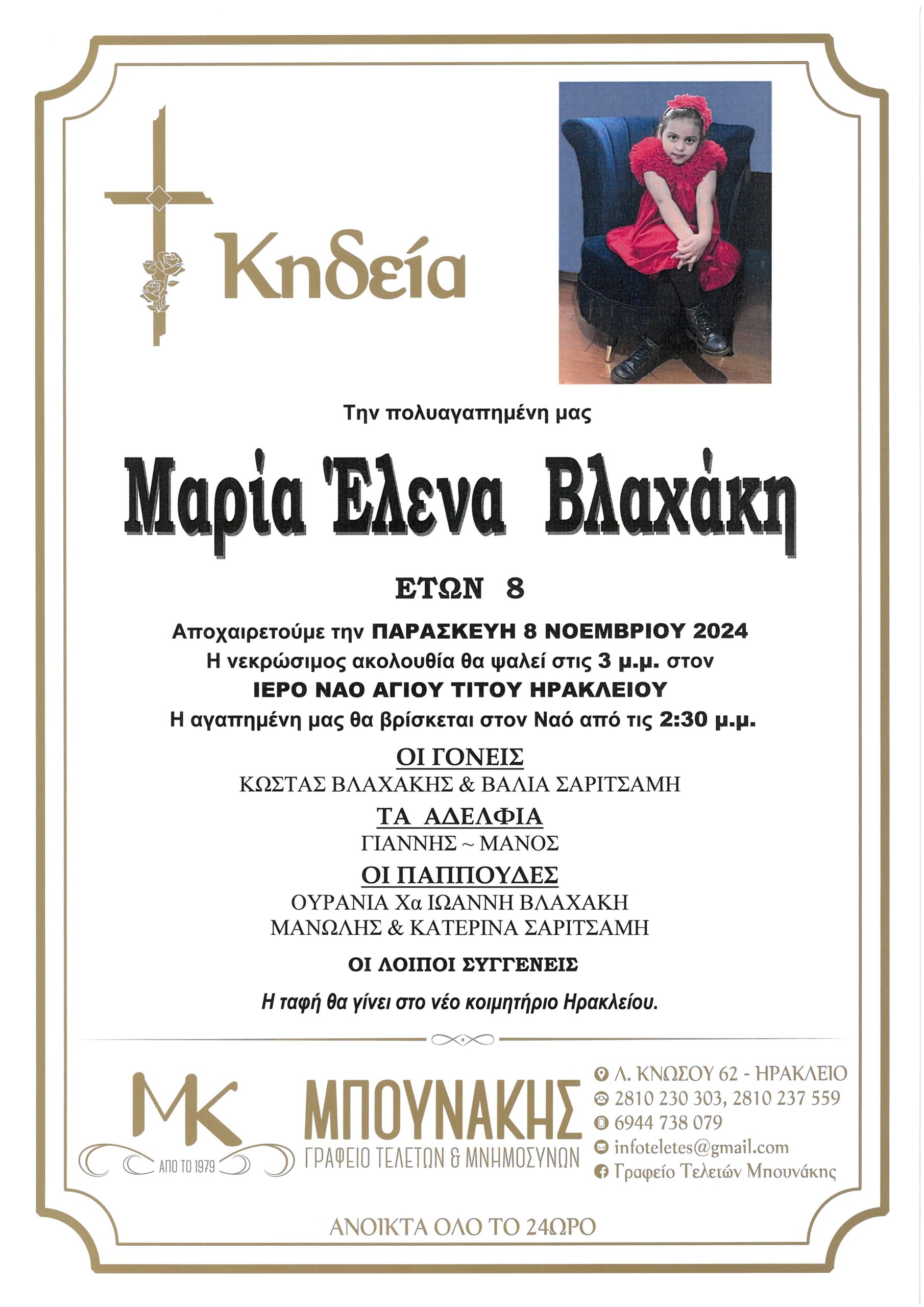 Απέραντη θλίψη σκόρπισε στο Ηράκλειο ο χαμός της 8χρονης Μαρίας – Έλενας Βλαχάκη. Το αγγελούδι, που έδωσε μεγάλη και σκληρή μάχη, δεν είναι πια κοντά μας.