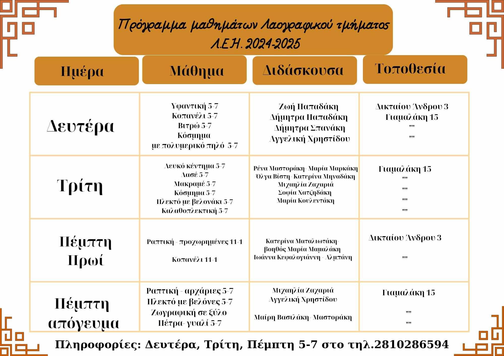 Ακολουθεί το εβδομαδιαίο πρόγραμμα για το έτος 2024-2025: