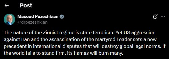 «Η φύση του σιωνιστικού καθεστώτος είναι η κρατική τρομοκρατία» δήλωσε από πλευράς του ο Ιρανός πρόεδρος Μασούντ Πεζεσκιάν σε ανάρτησή του στο X.