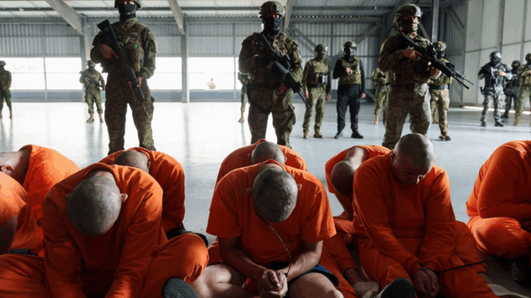 «Το έγκλημα ήθελε να προκαλέσει τον Ισημερινό (…) Σήμερα, ο Ισημερινός απάντησε με πράξεις», διατυμπάνισε μέσω X ο πρόεδρος Νομπόα, συνοδεύοντας την ανάρτηση με φωτογραφίες που εικονίζουν κάπου είκοσι κρατούμενους, με πορτοκαλί στολές, τα χέρια δεμένα, τα κεφάλια ξυρισμένα και σκυμμένα, καθιστούς, έχοντας πίσω τους στρατιωτικούς με αυτόματα τουφέκια και καλυμμένα πρόσωπα.