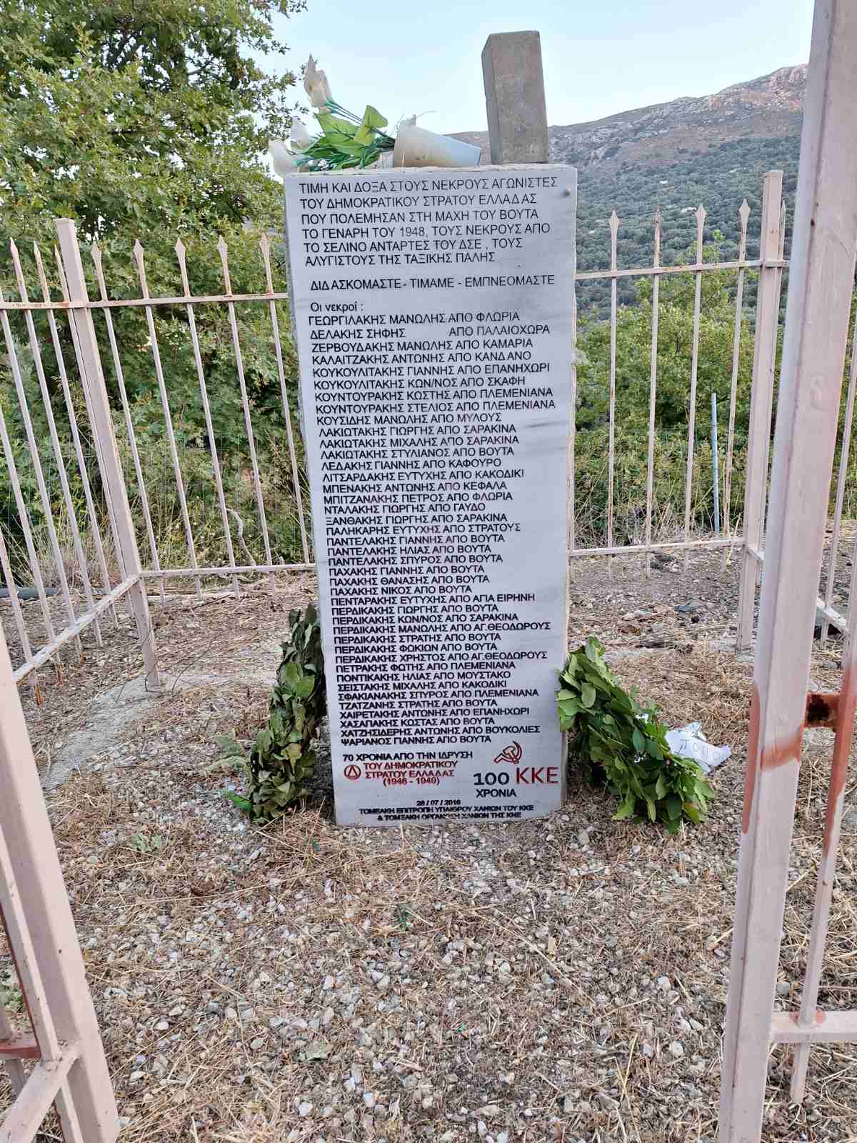 «Η Χαριτίνη Παπαδάκη, μετά από μία σύντομη παρουσίαση του χρονικού των γεγονότων της μάχης του Βουτά, τόνισε ότι εκδηλώσεις τέτοιες, στα μνημεία του ΕΛΑΣ και του ΔΣΕ κρίνουμε ως ΚΚΕ ότι όχι μόνο μας βοηθούν να κρατάμε ζωντανή τη μνήμη, την αγωνιστική παράδοση του λαού μας, αλλά και μας επιβάλλουν με έναν τρόπο σεμνό, να μη λυγίζουμε μπροστά στις δυσκολίες της ζωής, μπροστά στους αρνητικούς συσχετισμούς που διαπερνούν κάθε πτυχή της κοινωνίας μας. Για αυτό χαιρετίζουμε με αίσθημα τιμής και υπερηφάνειας την εκδήλωση στο μνημείο του ΔΣΕ στο Βουτά, της ιστορικής επαρχίας του Σελινου. Είμαστε εδώ για να τιμήσουμε τα ηρωικά παλικάρια που έδωσαν τη ζωή τους σε ένα πραγματικά άνισο, αλλά δίκαιο αγώνα. Γιατί είχαν ακλόνητη πίστη στο δίκιο του λαού, στην οικοδόμηση μίας άλλης κοινωνίας, χωρίς εκμετάλλευση, χωρίς εξαρτήσεις, αλλά δίκαιης και ειρηνικής. Αυτόν τον αγώνα έδωσε τότε ο ΔΣΕ , αυτόν τιμούμε κι εδώ σήμερα.
