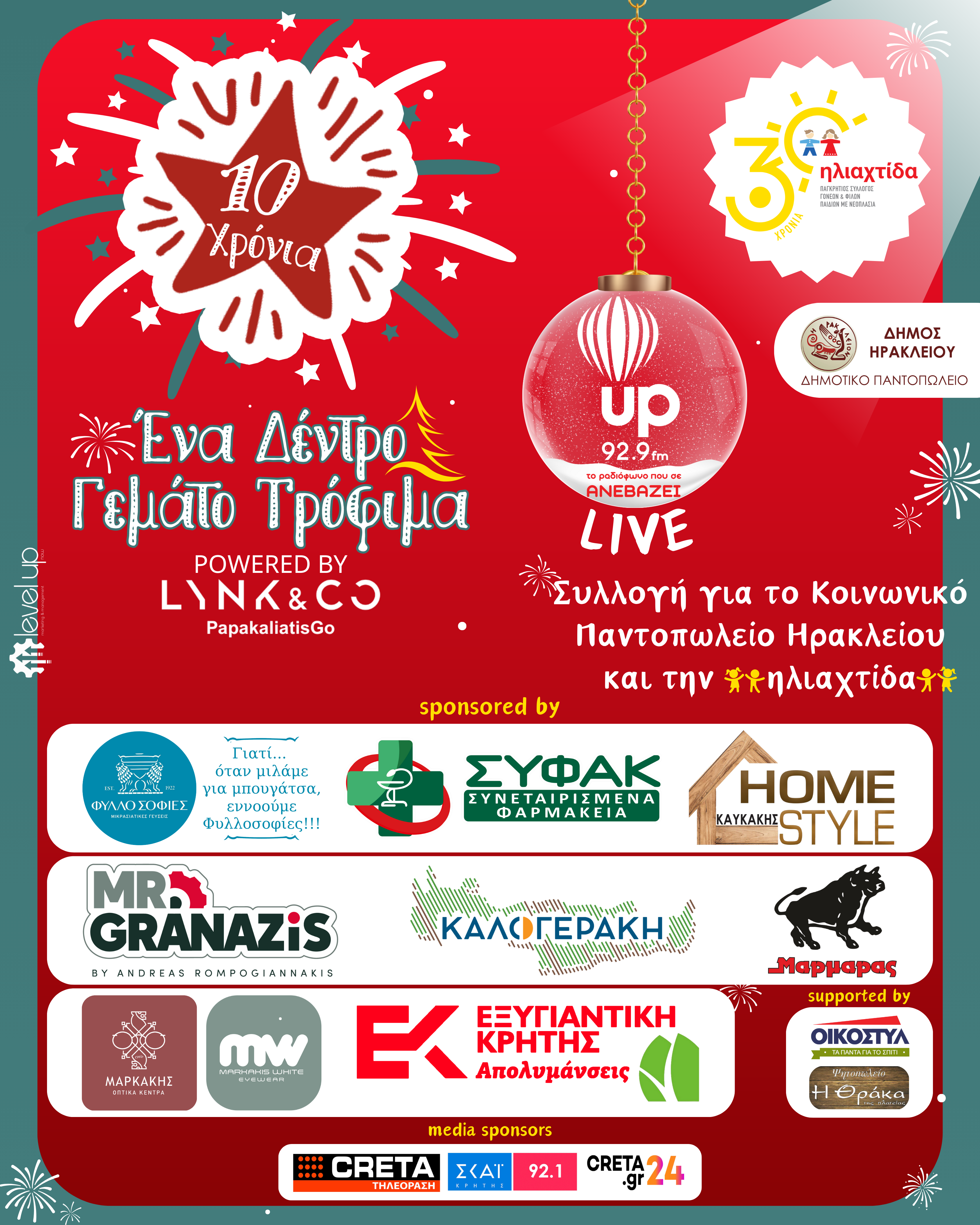 Με απόλυτη επιτυχία ολοκληρώθηκε η φιλανθρωπική δράση «Ένα Δέντρο Γεμάτο Τρόφιμα», που διοργάνωσε για 10η χρονιά ο up 92,9, σε συνεργασία με τον Δήμο Ηρακλείου, στην Πλατεία Ελευθερίας, στο κέντρο της πόλης.