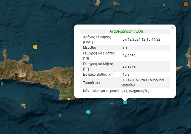 Σεισμός σημειώθηκε το μεσημέρι του Σαββάτου ανοιχτά του Λασιθίου.