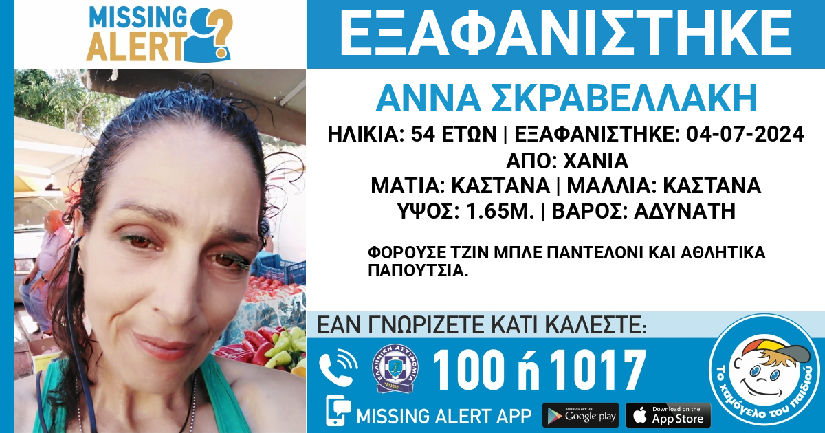 Η 54χρονη εξαφανίστηκε στις 04/07/2024, στις 09.00πμ, από την περιοχή των Χανίων. Το «Χαμόγελο του Παιδιού» ενημερώθηκε για την εξαφάνιση της Σκαρβελλάκη Άννας, σήμερα στις 12/07/2024 και προχώρησε στη δημοσιοποίηση των στοιχείων της ενήλικης, κατόπιν αιτήματος της οικογένειάς της, καθώς υπάρχουν λόγοι, οι οποίοι θέτουν την ζωή της σε κίνδυνο.