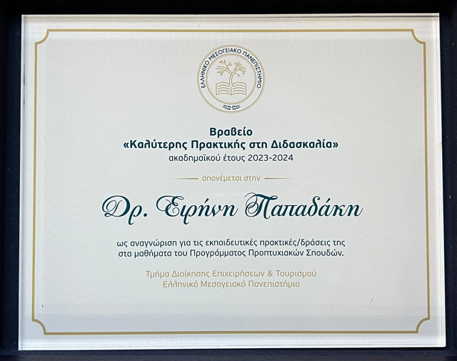 Το Τμήμα Διοίκησης Επιχειρήσεων και Τουρισμού του Ελληνικού Μεσογειακού Πανεπιστημίου διακρίνεται τα τελευταία χρόνια για τις πρωτοβουλίες του που αφορούν στην αναβάθμιση της εκπαιδευτικής διαδικασίας και για την έμφαση που δίνει στη φοιτητοκεντρική μάθηση. Σε αυτά τα πλαίσια προχώρησε φέτος σε μία ακόμα καινοτομία, αυτή της θέσπισης βραβείου “Καλύτερης Πρακτικής στη Διδασκαλία”.