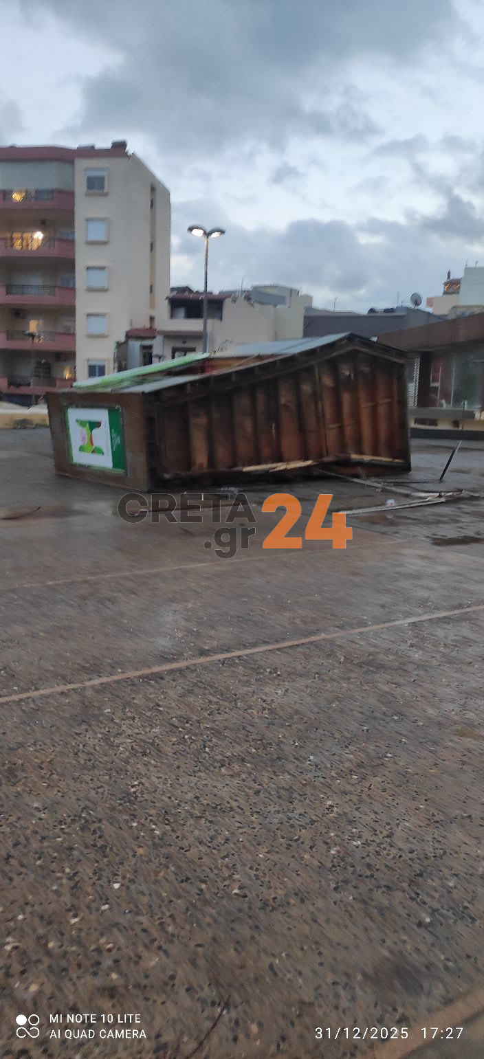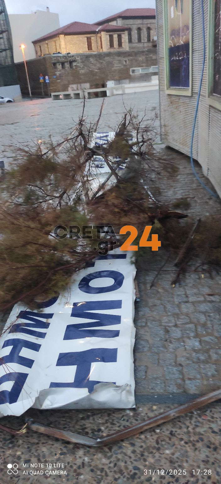 Στην Πλατεία Κορνάρου, τμήματα από στέγαστρα έπεσαν στο έδαφος από τους ισχυρούς ανέμους και τις βροχοπτώσεις σήμερα το απόγευμα (31/12), ενώ σημειώθηκαν και πτώσεις κλαδιών.