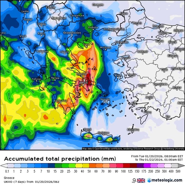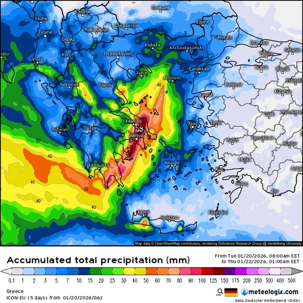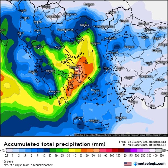 οι μεγάλες ποσότητες νερού που αναμένεται να δεχτούν κυρίως η Ανατολική και η Νότια Πελοπόννησος, η Κεντρική και Ανατολική Στερεά, η Εύβοια, η Ανατολική και η Νότια Θεσσαλία,