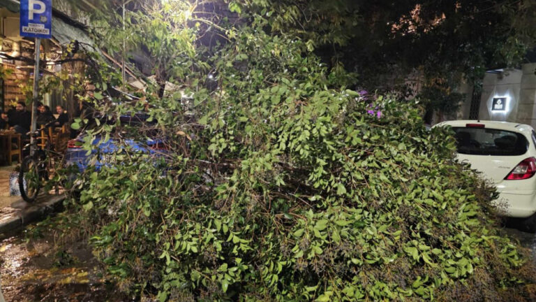 Από τις πτώσεις των δέντρων προκλήθηκαν ζημιές σε σταθμευμένα αυτοκίνητα.