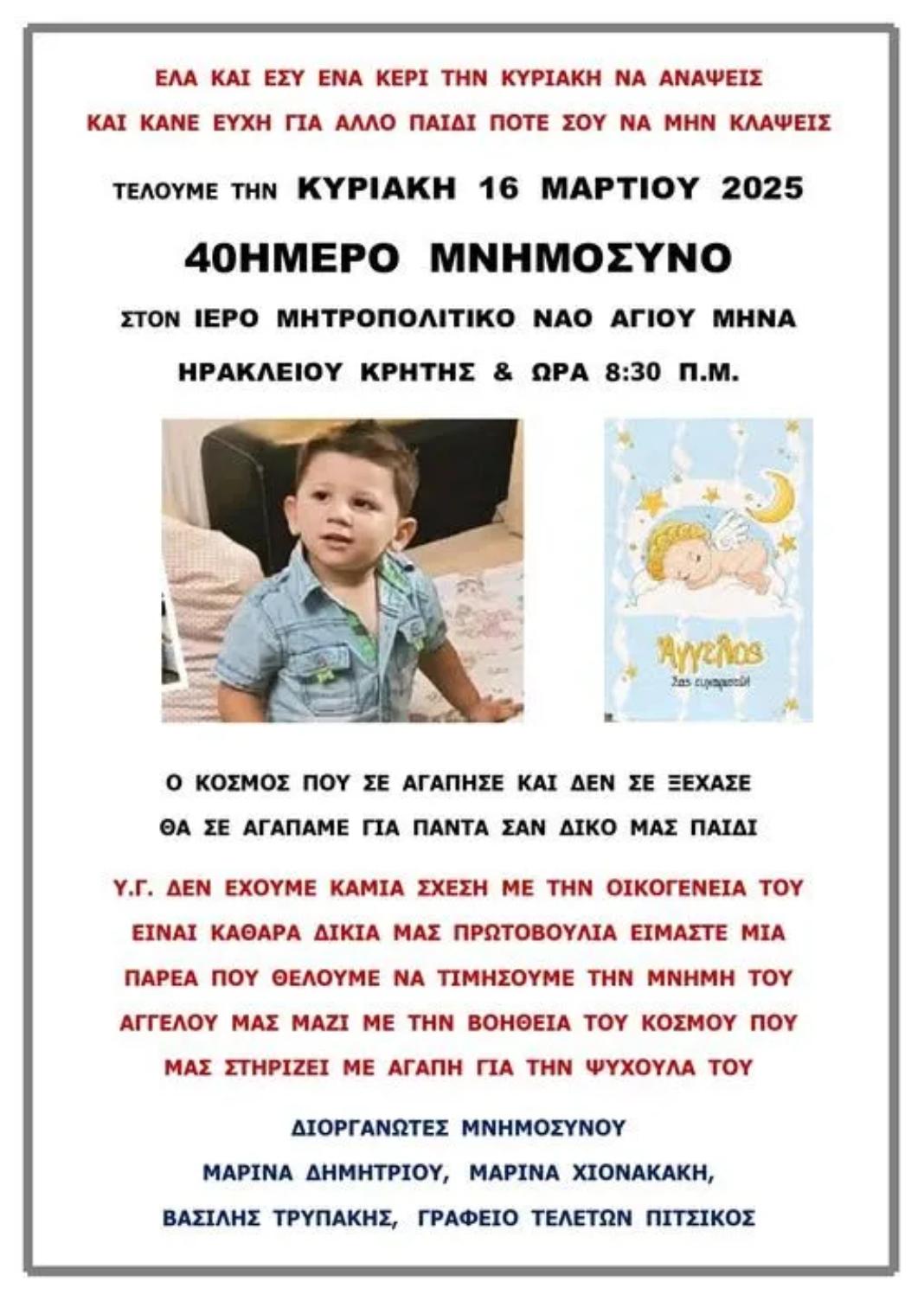 Στο μεταξύ, συμπληρώνονται 40 ημέρες από την ανείπωτη τραγωδία, από την 4η Φεβρουαρίου, οπότε και ο Άγγελος «έφυγε» από τη ζωή. Στον Ιερό Μητροπολιτικό Ναό του Αγίου Μηνά, μετά από πρωτοβουλία ομάδας πολιτών, θα πραγματοποιηθεί μνημόσυνο για τις 40 ημέρες από τον θάνατο του τρίχρονου παιδιού.