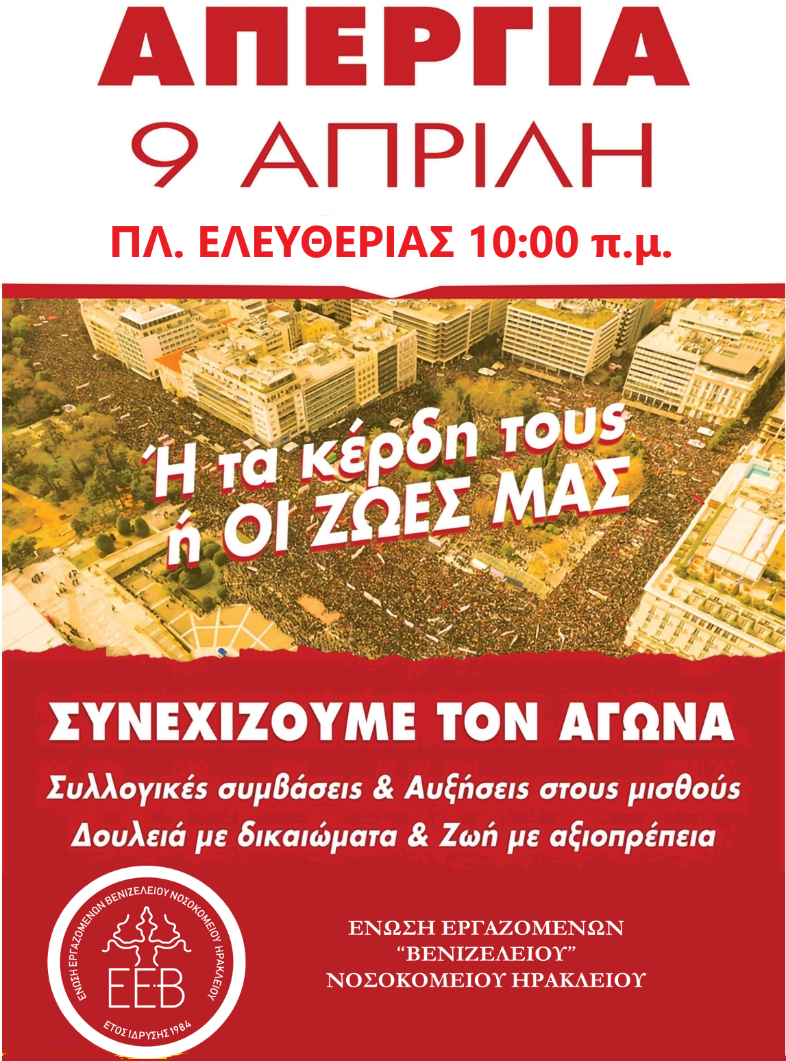 Κάλεσμα για συμμετοχή στην απεργία της 9ης Απριλίου απευθύνει η Ένωση Εργαζομένων Βενιζελείου.