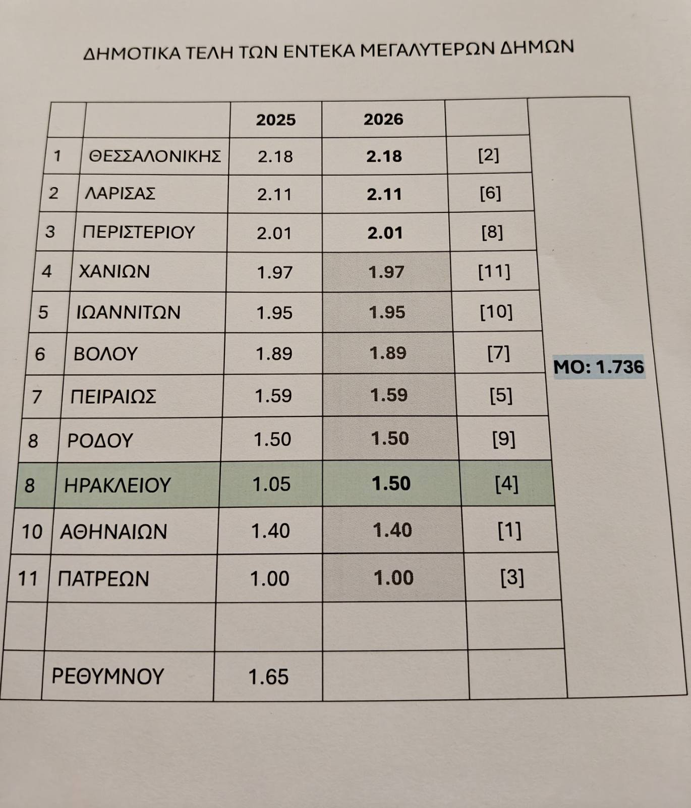 Στο πλαίσιο της συνέντευξης τύπου, δόθηκε και ο πίνακας με τον μέσο όρο των οικιακών τελών στους 11 μεγαλύτερους δήμους της χώρας, αφού όπως αναφέρθηκε η δημοτική αρχή ακολουθεί τη δέσμευση ότι «τα Δημοτικά Τέλη στο Ηράκλειο θα παραμείνουν χαμηλότερα από τον μέσο όρο Δήμων με παραπλήσια χαρακτηριστικά».