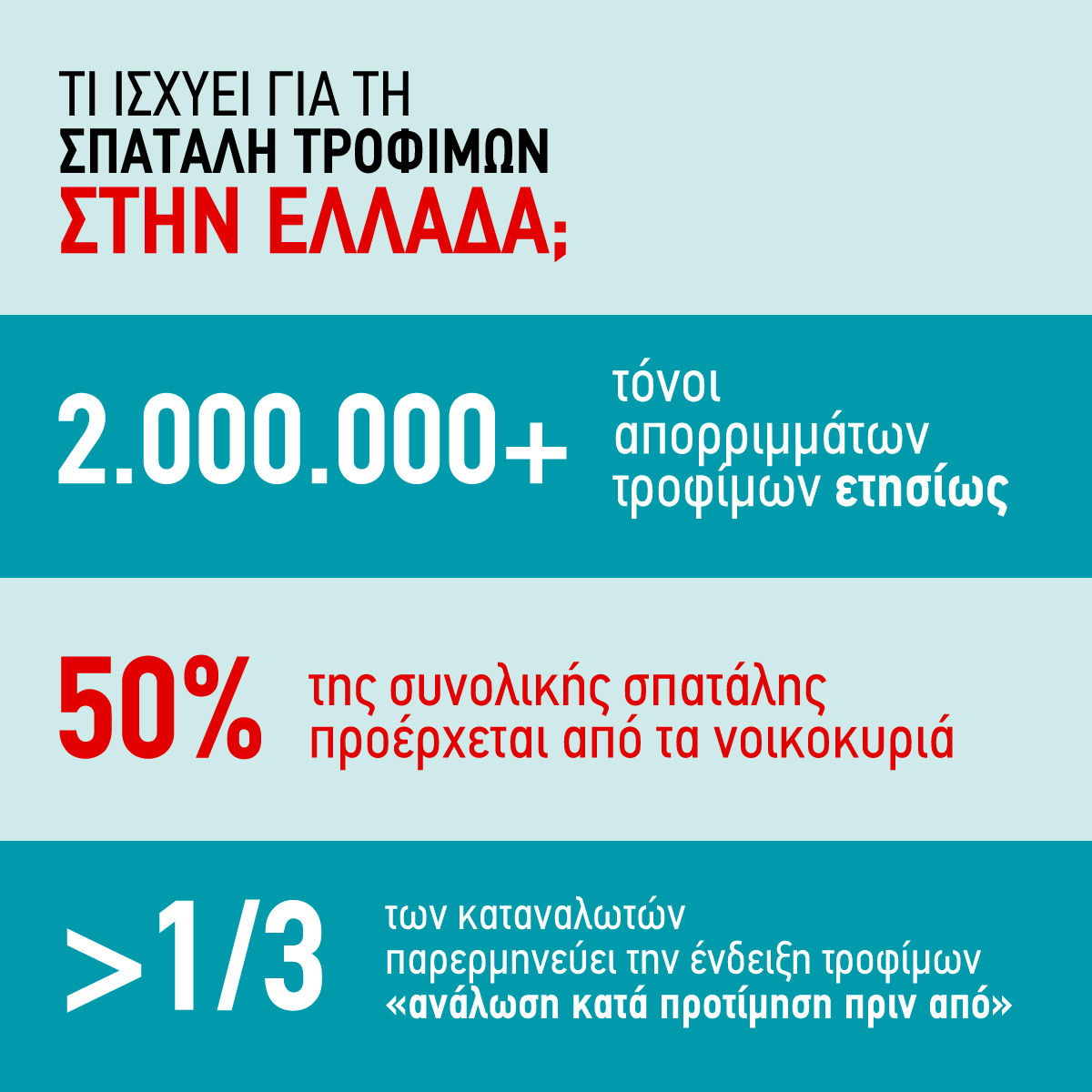 Σύμφωνα με στοιχεία, πάνω από 2 εκατομμύρια τόνοι απορριμμάτων τροφίμων παράγονται ετησίως στη χώρα μας, με τα νοικοκυριά να ευθύνονται για το 50% της συνολικής σπατάλης.