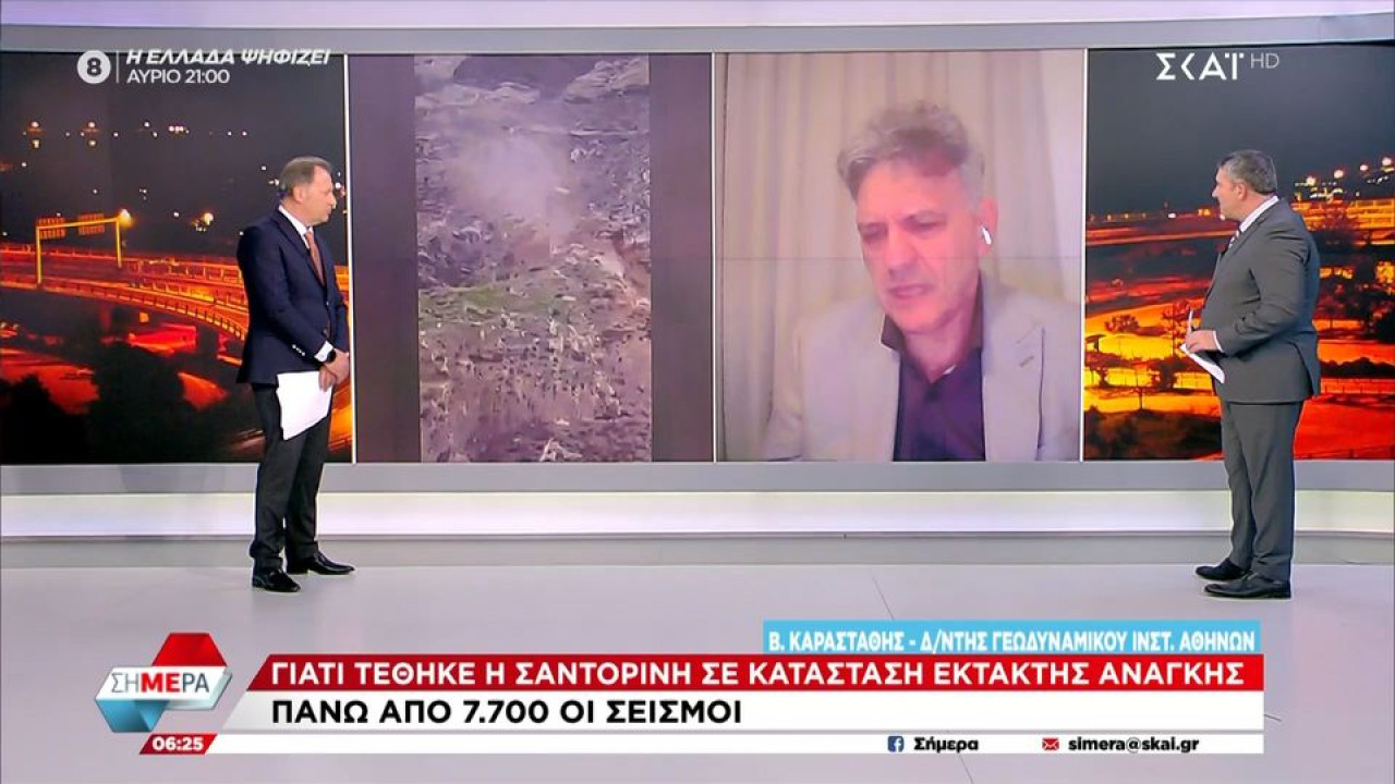 «Είμαστε σε φάση σταθερότητας και από τη μία στιγμή στην άλλη μπορεί να πάμε σε αποκλιμάκωση» ανέφερε στον ΣΚΑΪ ο Διευθυντής του Γεωδυναμικού Ινστιτούτου Αθηνών, Βασίλης Καραστάθης, μιλώντας στο «Σήμερα» για τους αλλεπάλληλους σεισμούς στη Σαντορίνη.
