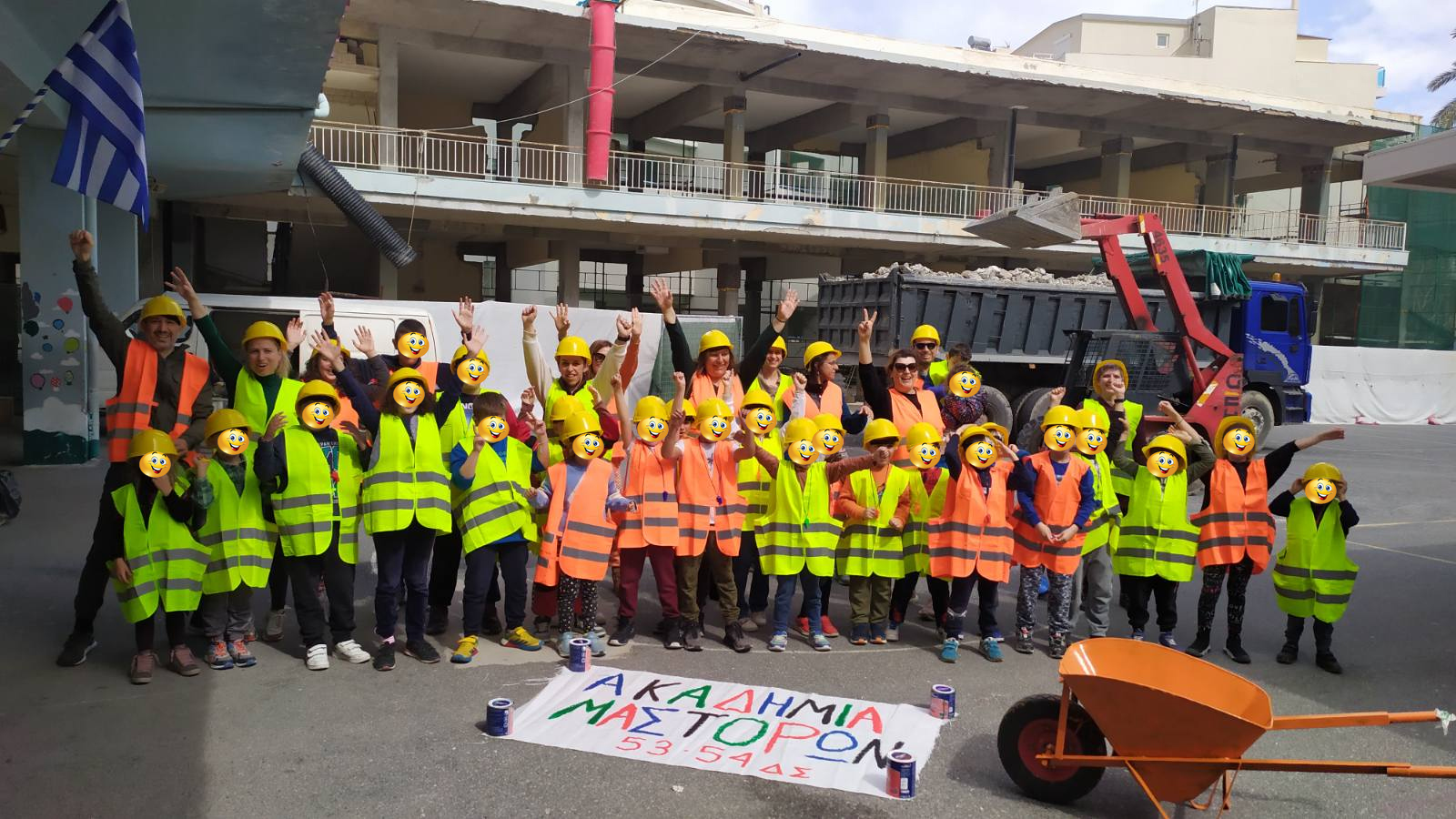 «Τα παιδιά σατίρισαν με αυτό τον τρόπο τις καθυστερήσεις που έχουν προκύψει στο έργο και την αναστάτωση που έχει προκληθεί στο σχολείο με την τοποθέτηση κοντέινερ και τον περιορισμό του χώρου της αυλής τους, κάτι που είναι μεν αναμενόμενο για την ολοκλήρωση της στατικής ενίσχυσης στα τρία κτίρια του συγκροτήματος αλλά φαίνεται πως θα συνεχίζεται τουλάχιστον μέχρι το καλοκαίρι του 2025. (Η αρχική σύμβαση προέβλεπε το έργο να έχει παραδοθεί τον Σεπτέμβρη του 2023).