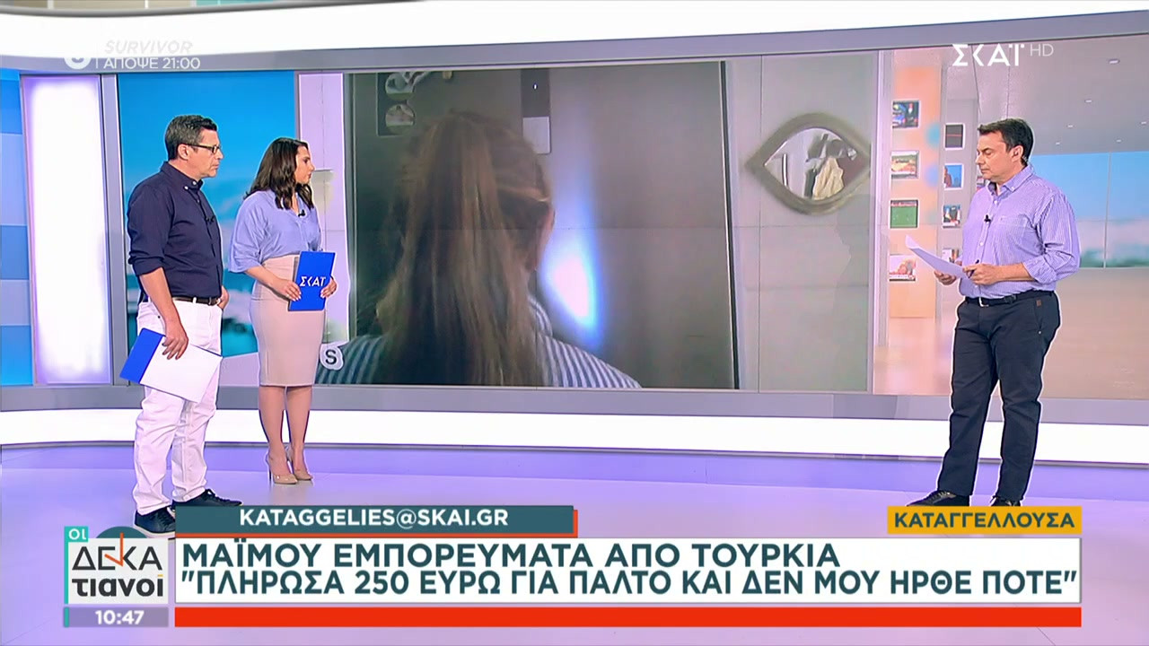 Δίχως τέλος είναι οι καταγγελίες πολιτών στον ΣΚΑΪ για απάτες που συναντούν στο διαδίκτυο. ‘Οπως κατήγγειλε τηλεθεάτρια σήμερα στην εκπομπή «Δεκατιανοί» με τους Γιάννη Πιτταρά και Γιώργο Γρηγοριάδη, έχει παραγγείλει ένα παλτό από ηλεκτρονικό κατάστημα που συνάντησε στα μέσα κοινωνικής δικτύωσης και δεν το παρέλαβε ποτέ.
