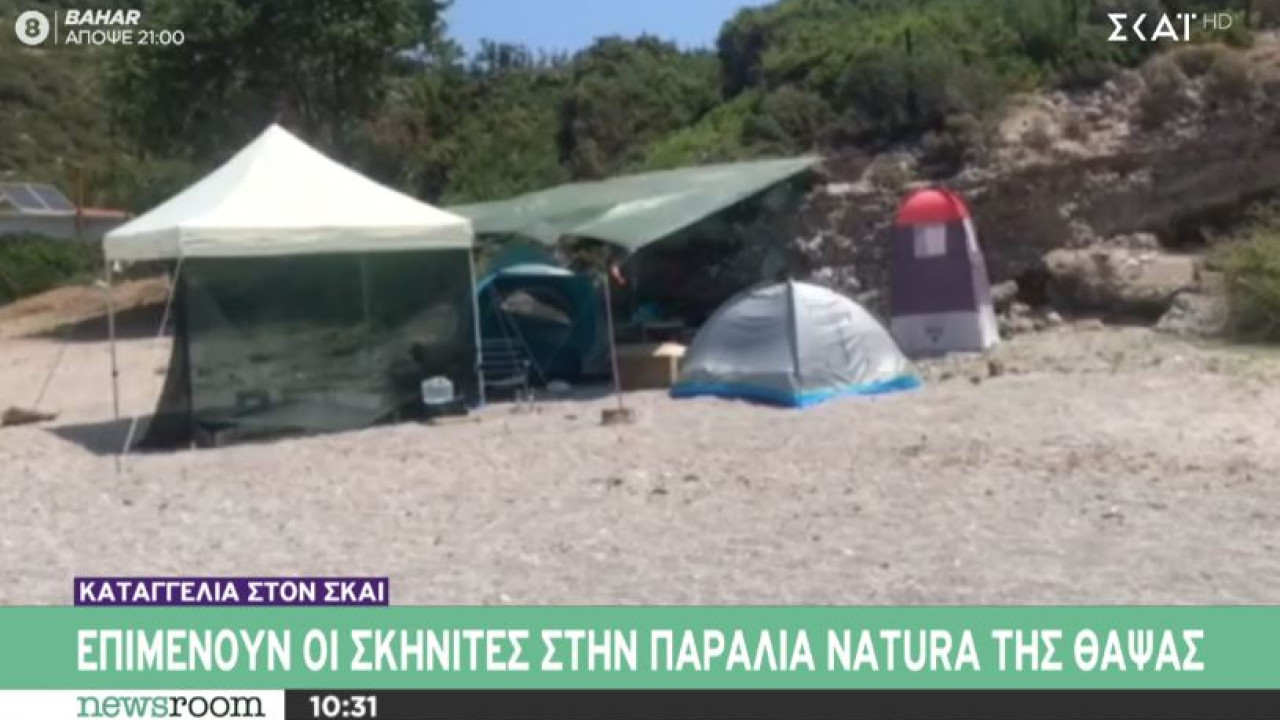 Παρά την έκταση που πήρε τον Ιούνιο το θέμα με την καταπατημένη από κατασκηνωτές στην Natura παραλία Θαψά στην Εύβοια – και τα πρόστιμα που επιβλήθηκαν – καταγγελίες τηλεθεατών στο ΣΚΑΪ αναφέρουν ότι ακόμα και σήμερα λουόμενοι βάζουν ομπρέλες και στήνουν τέντες στην παραλία – αν και απαγορεύεται.