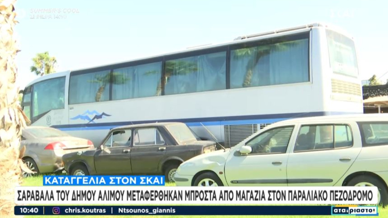 Εδώ και περίπου 2 μήνες παλιά, εγκαταλελειμμένα αυτοκίνητα και ένα πούλμαν έχουν τοποθετηθεί στον παραλιακό πεζόδρομο του Αλίμου, στο γκαζόν μπροστά από γνωστή καφετέρια, με αποτέλεσμα πολλοί πολίτες να κάνουν καταγγελία για το θέαμα στον ΣΚΑΪ.