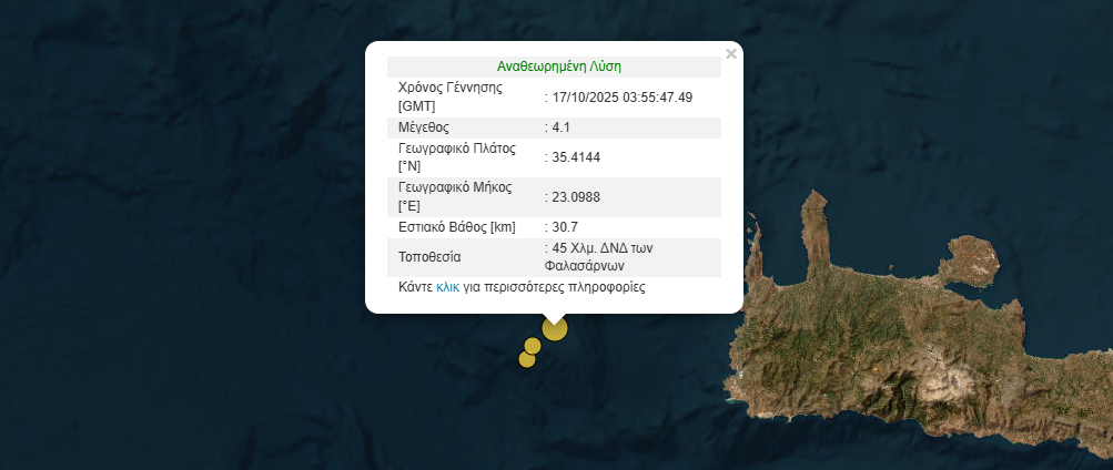 24 ώρες μετά τον χθεσινό πρωινό σεισμό ανοιχτά της Κρήτης και συγκεκριμένα στην περιοχή του Λασιθίου, νέα σεισμική δόνηση έγινε αισθητή νωρίς το πρωί σήμερα Παρασκευή 17/10, αυτή τη φορά δυτικά του νησιού.