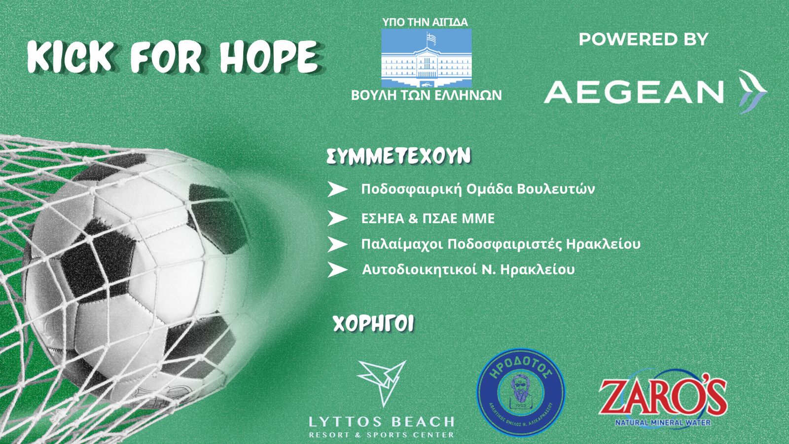 Πέντε κοινωνικές δομές του Νομού Ηρακλείου, με την πρωτοβουλία του Λευτέρη Αυγενάκη, πρ. Υπουργού – Βουλευτή Ν. Ηρακλείου και του Σπύρου Κουλκουδίνα, Βουλευτή Ν. Πιερίας – Συντονιστή της ποδοσφαιρικής ομάδας των Βουλευτών, διοργανώνουν το φιλανθρωπικό ποδοσφαιρικό τουρνουά «Kick for Hope – powered by AEGEAN», το οποίο τελεί υπό την αιγίδα της Βουλής των Ελλήνων.