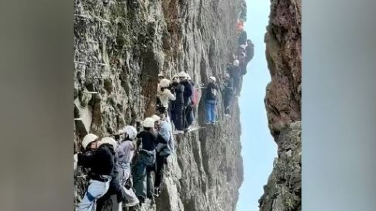 Οι εικόνες των ορειβατών που κρέμονται στην άκρη του βράχου καθώς περίμεναν άλλους να προχωρήσουν κατά μήκος της via ferrata -μεταλλικές σκάλες ασφαλισμένες στο βουνό- έγιναν viral στα κινεζικά μέσα κοινωνικής δικτύωσης.