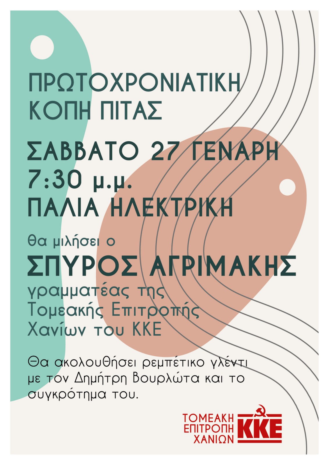 Η Τομεακή Επιτροπή Χανίων του ΚΚΕ καλεί τη νεολαία και τον λαό των Χανίων στην κοπή της πρωτοχρονιάτικης πίτας της, το Σάββατο 27 Ιανουαρίου, στις 7.30μ.μ. στην Παλιά Ηλεκτρική.