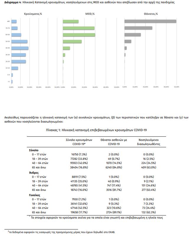Ο αριθμός των ασθενών που νοσηλεύονται διασωληνωμένοι είναι 649 (67.3% άνδρες). Η διάμεση ηλικία τους είναι 68 έτη. To 82.6% έχει υποκείμενο νόσημα ή/και ηλικία 70 ετών και άνω. Από την αρχή της πανδημίας έχουν εξέλθει από τις ΜΕΘ 1.555 ασθενείς. Οι εισαγωγές2 νέων ασθενών Covid-19 στα νοσοκομεία της επικράτειας είναι 507 (ημερήσια μεταβολή -3.43%). Ο μέσος όρος εισαγωγών του επταημέρου είναι 459 ασθενείς.Η διάμεση ηλικία των κρουσμάτων είναι 44 έτη (εύρος 0.2 έως 105 έτη), ενώ η διάμεση ηλικία των θανόντων είναι 79 έτη (εύρος 0 έως 103 έτη).