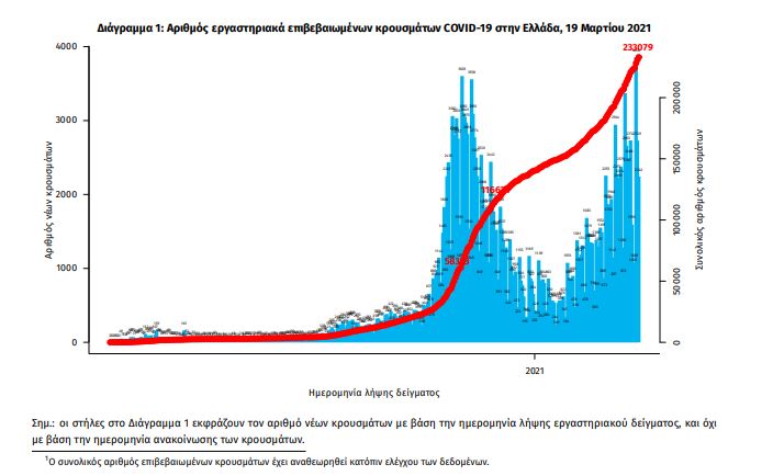 Τα στοιχεία που παρουσιάζονται αφορούν περιστατικά από την επιδημιολογική επιτήρηση της νόσου από το νέο κορωνοϊό (COVID19), με βάση τα δεδομένα που έχουν δηλωθεί στον ΕΟΔΥ και καταγραφεί μέχρι τις 19 Μαρτίου 2021 (ώρα 15:00). Τα νέα εργαστηριακά επιβεβαιωμένα κρούσματα της νόσου που καταγράφηκαν τις τελευταίες 24 ώρες είναι 2.785, εκ των οποίων 16 εντοπίστηκαν κατόπιν ελέγχων στις πύλες εισόδου της χώρας. Ο συνολικός αριθμός των κρουσμάτων ανέρχεται σε 233.079 (ημερήσια μεταβολή +1.2%), εκ των οποίων 51.6% άνδρες. 1 Με βάση τα επιβεβαιωμένα κρούσματα των τελευταίων 7 ημερών, 75 θεωρούνται σχετιζόμενα με ταξίδι από το εξωτερικό και 2.101 είναι σχετιζόμενα με ήδη γνωστό κρούσμα. Ημερήσια εξέλιξη της πανδημίας: Η ημερήσια κατανομή των επιβεβαιωμένων κρουσμάτων είναι η ακόλουθη (η γραμμή παριστάνει την συνολική, αθροιστική κατανομή των κρουσμάτων).