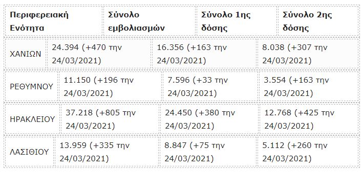 Συνολικά 57.249 άνθρωποι είχαν λάβει μια δόση εμβολίου κατά του κορωνοϊού στην Κρήτη, ή αλλιώς ποσοστό 9,1% επί του πληθυσμού.