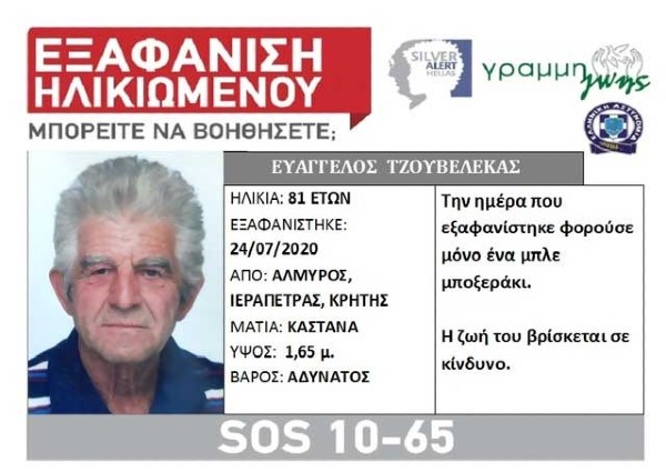 Έκκληση σε όλους να βοηθήσουν στην ανεύρεση του 81χρονου Ευάγγελου Τζουβελέκα που αγνοείται από τις 24 Ιουλίου απευθύνει η κόρη του Εμμανουέλα Τζουβελέκα.