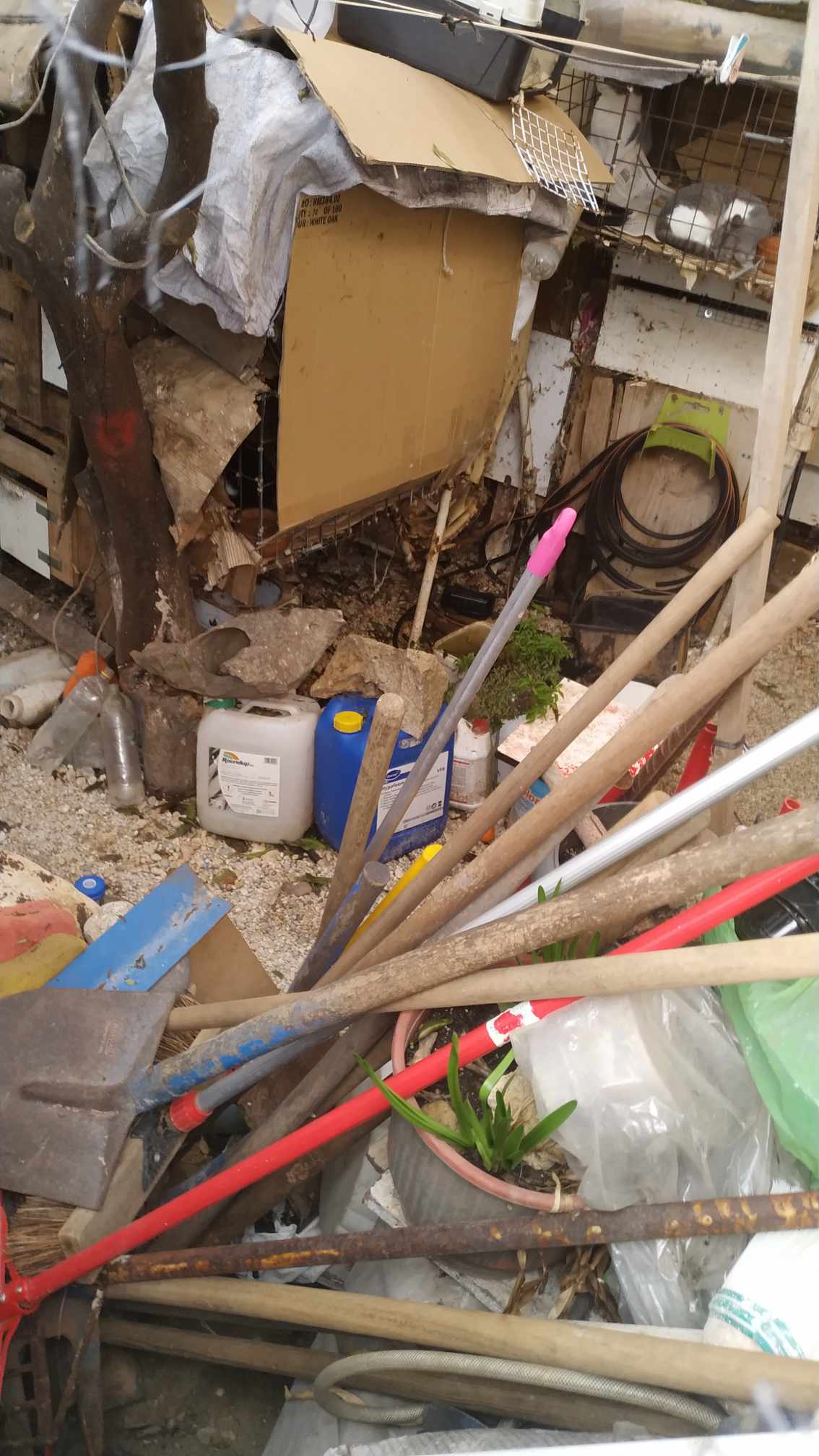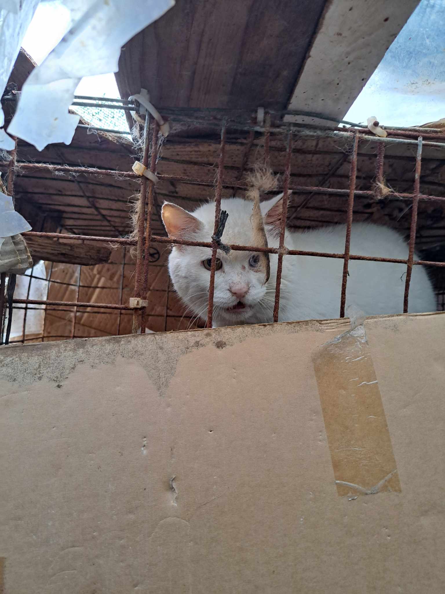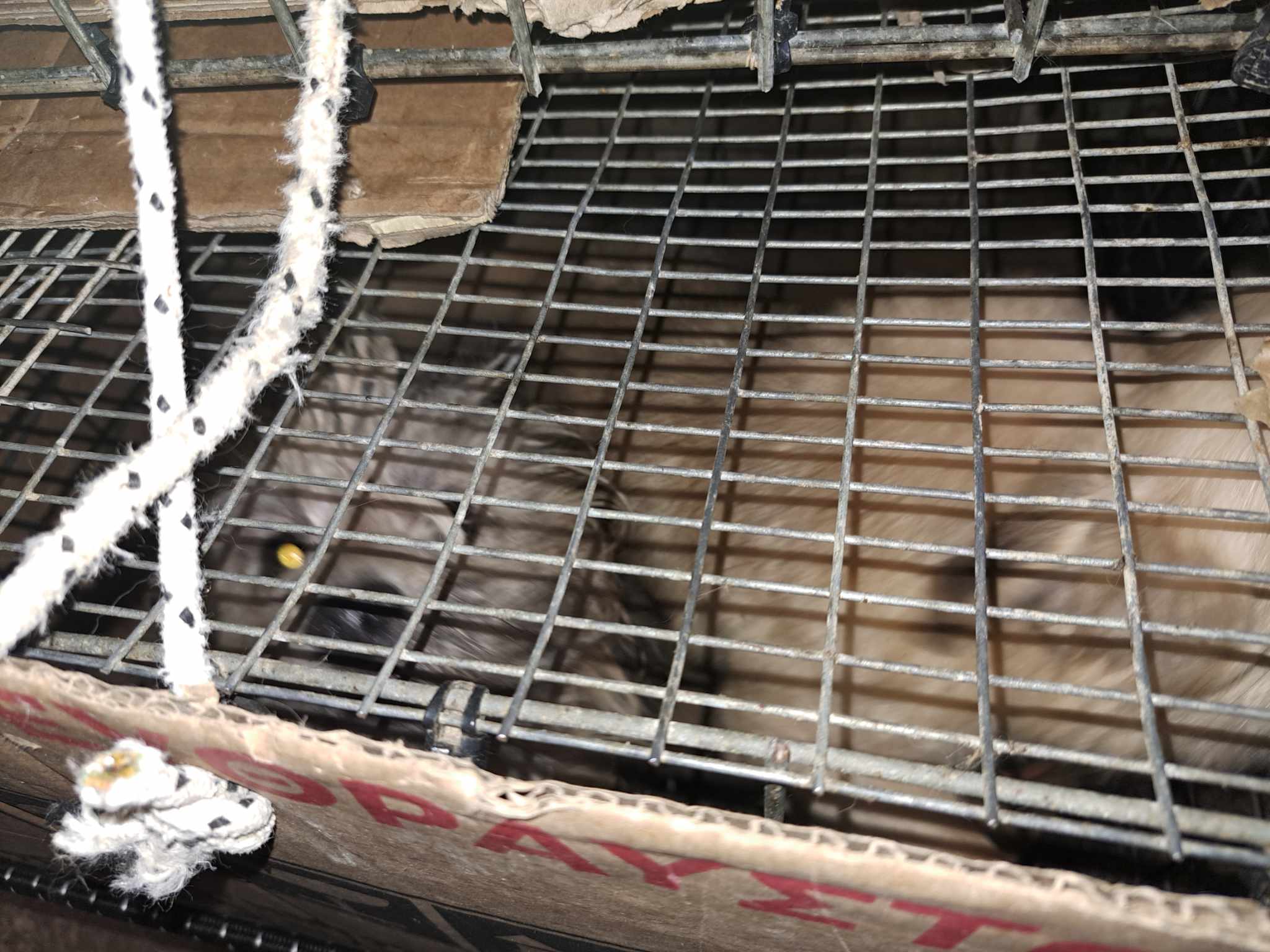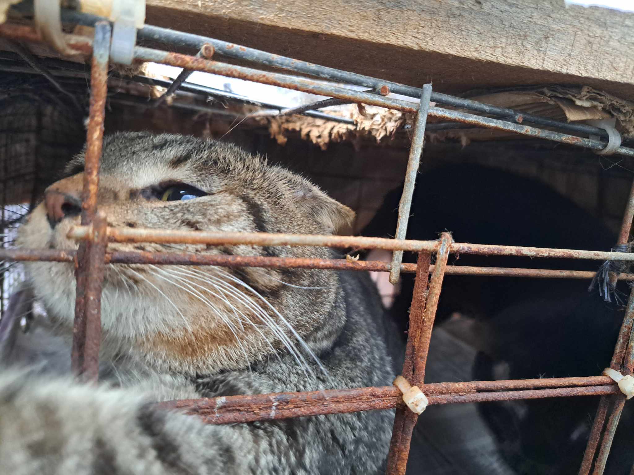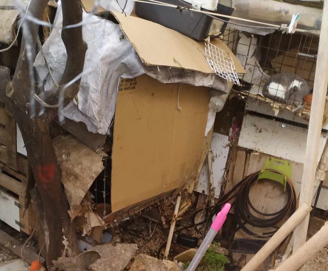 Στο χώρο της αυλής αλλά και μέσα στο σπίτι, πέραν των σκουπιδιών και της βρωμιάς που επικρατούσε, υπάρχουν αυτοσχέδια ξύλινα κουτιά, κλουβιά από παλέτες σκεπασμένα με χαρτόκουτες και νάιλον, συρμάτινα σκουριασμένα κλουβιά καλυμμένα εντελώς, στα οποία μέσα ζούν στρυμωγμένες (ανά ομάδες) 77 ΓΆΤΕΣ!!! Οι γάτες ζούν στο σκοτάδι, πολλές φαίνονται άρρωστες και οι περισσότερες δεν είχαν χώρο καν να κουνηθούν.