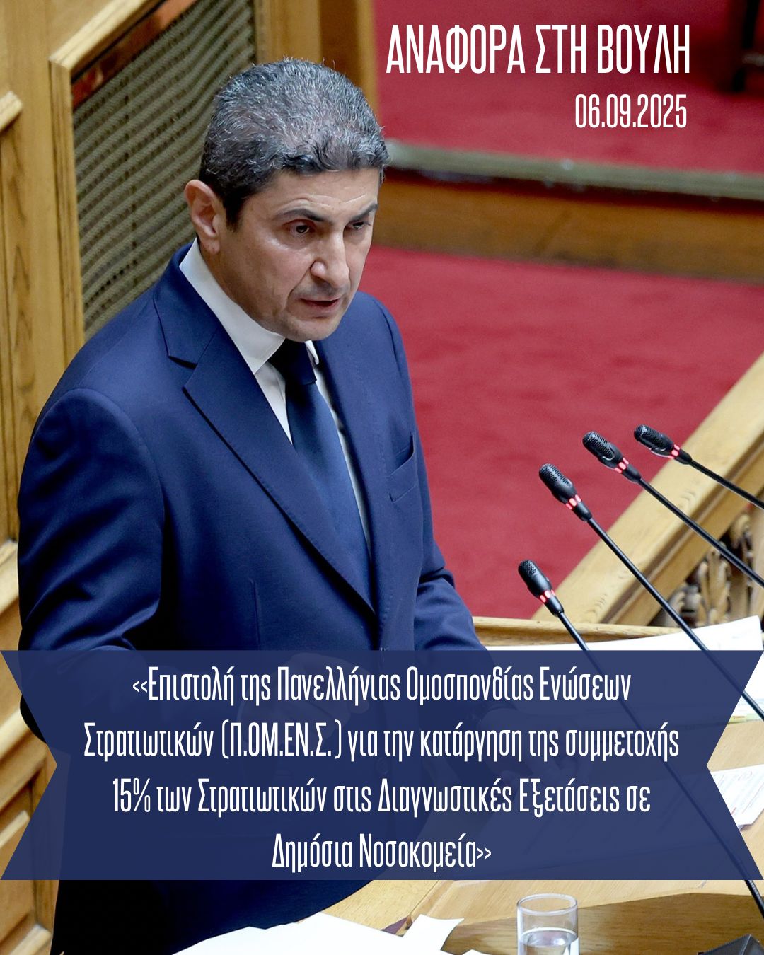 Την από 05.08.2025 επιστολή της Πανελλήνιας Ομοσπονδίας Ενώσεων Στρατιωτικών (Π.ΟΜ.ΕΝ.Σ.), με την οποία αναδεικνύονται σοβαρά ζητήματα που έχουν προκύψει από την επιβολή συμμετοχής 15% στις διαγνωστικές εξετάσεις των στρατιωτικών σε δημόσια νοσοκομεία, κατέθεσε στη Βουλή με Αναφορά του προς τον Υπουργό Εθνικής Άμυνας κ. Νίκο Δένδια, ο π. Υπουργός – Βουλευτής Ηρακλείου, Λευτέρης Αυγενάκης.