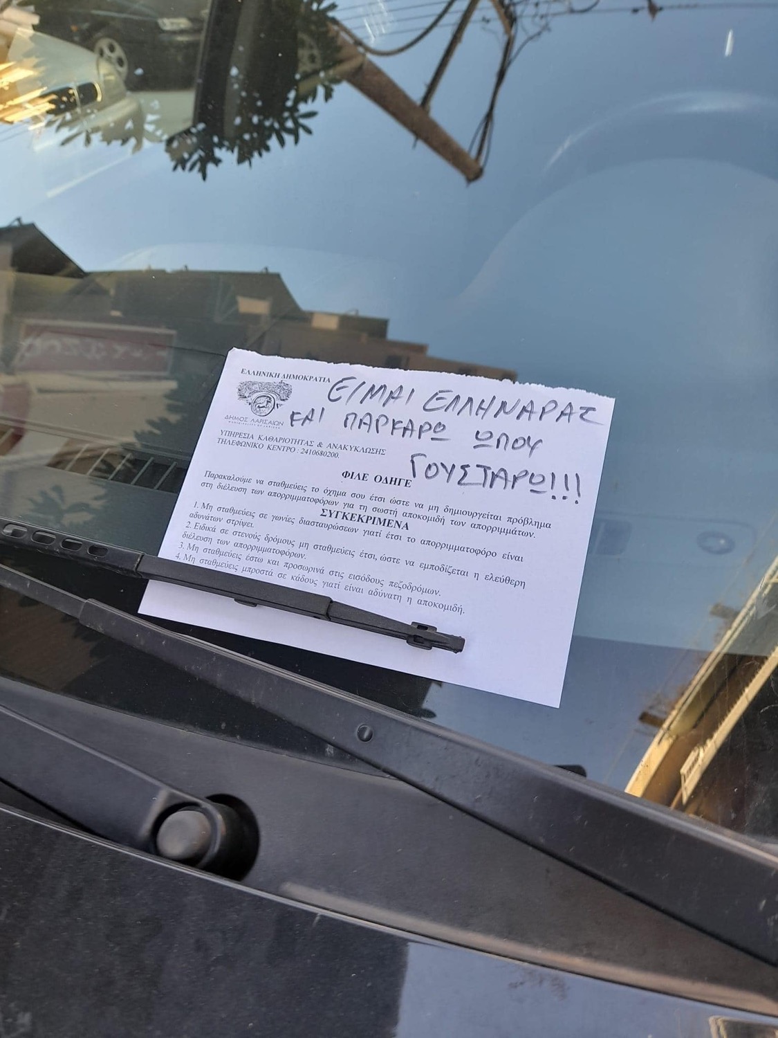 Συγκεκριμένα συνεργείο της Υπηρεσίας Καθαριότητας & Ανακύκλωσης εναπόθεσε στο παρμπρίζ του συγκεκριμένου οχήματος σημείωμα στο οποίο αναγραφόταν τα εξής: