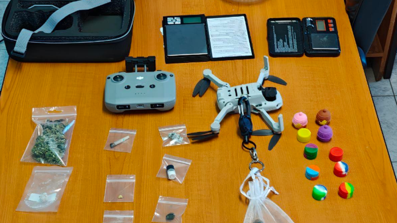 Κατά τη διάρκεια της έρευνας βρέθηκαν και κατασχέθηκαν 15,1 γραμμάρια κάνναβη, μικροποσότητα κατεργασμένης κάνναβης τύπου σοκολάτας, μικροποσότητα μεθυλαινοδιοξυμεθαμφεταμίνης «MDMA», αυτοσχέδιο τσιγάρο με κάνναβη, μικροποσότητα έλαιου κάνναβης, 2 ζυγαριές ακριβείας, 1 drone με ειδικά προσαρμοσμένο γάντζο με πουγκί το οποίο περιείχε κρύπτη με υπολείμματα κάνναβης, 10 λαστιχένιες κρύπτες με υπολείμματα ακατέργαστης κάνναβης, 1 βάζο με υπολείμματα ακατέργαστης κάνναβης.