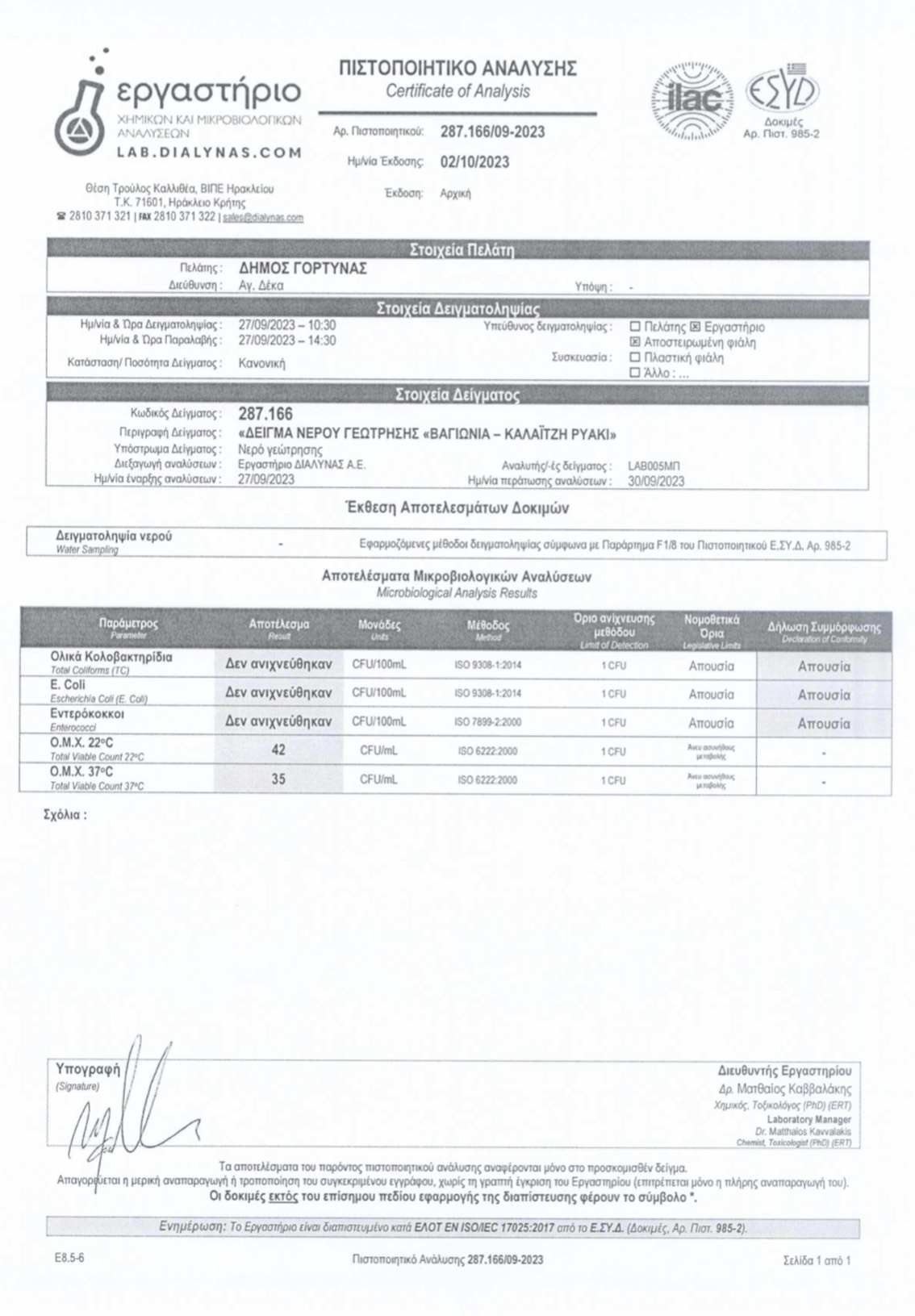 Κατόπιν νέας δειγματοληψίας και ελέγχου της ποιότητας του νερού που πραγματοποιήθηκε στις 27 Σεπτεμβρίου 2023, με δείγμα από την νέα γεώτρηση της Βαγιωνιάς – Καλαϊτζή Ρυάκι, επιβεβαιώθηκε ότι το νερό που καταλήγει στην δεξαμενή της κοινότητας είναι άριστης ποιότητας και απολύτως κατάλληλο προς χρήση από τους κατοίκους της περιοχής.