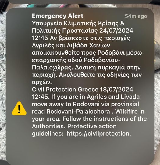 Λίγο μετά τις 12:00 το μεσημέρι μήνυμα από τον αριθμό 112 εστάλη στους κατοίκους της περιοχής με την προτροπή να παραμείνουν σε ετοιμότητα και να ακολουθούν τις οδηγίες των αρχών.