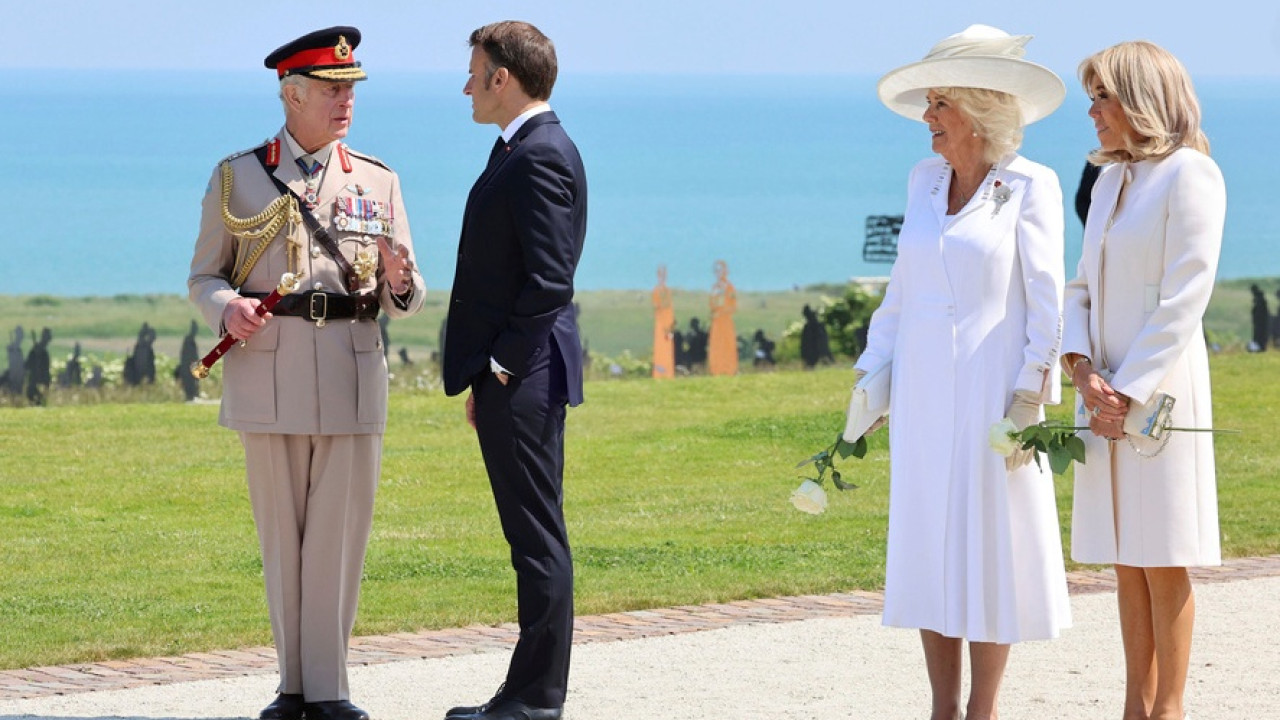 Στο βίντεο, γαλλικά μαχητικά αεροσκάφη σχηματίζουν τη γαλλική σημαία, ενώ ο Μακρόν, η «πρώτη κυρία» Μπριζίτ, ο βασιλιάς Κάρολος και η βασίλισσα Καμίλα βρίσκονται στο ηρώο της D-Day