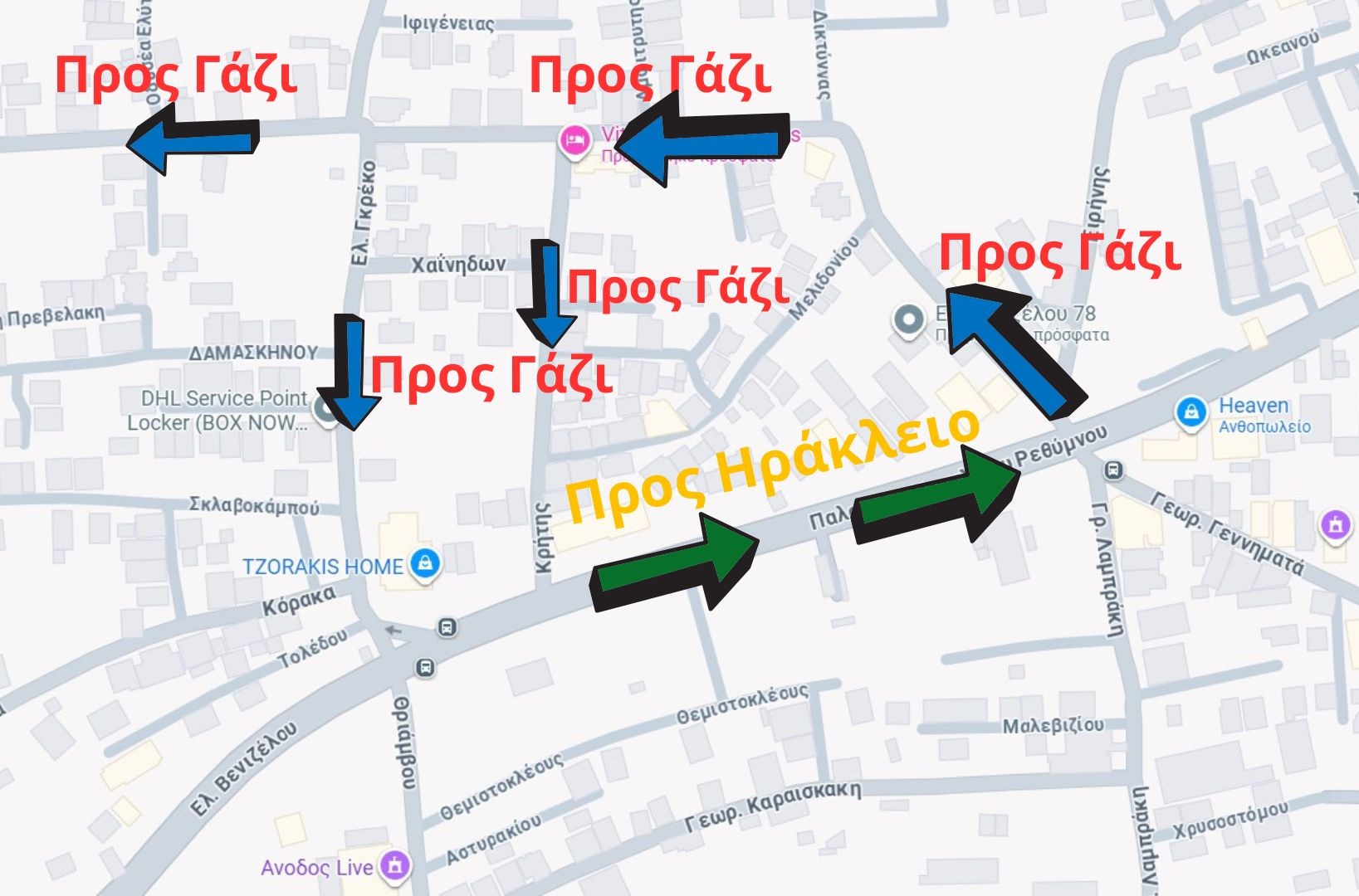 - Τα οχήματα με κατεύθυνση από Ηράκλειο προς Γάζι θα πρέπει να στρίβουν δεξιά στην οδό Εθνικής Αντιστάσεως και στη συνέχεια αριστερά είτε στην οδό Κρήτης είτε στην οδό Ελ Γκρέκο, ώστε να επανέρχονται στη Λεωφόρο Ελευθερίου Βενιζέλου μέσω του κόμβου Ανόδου.
