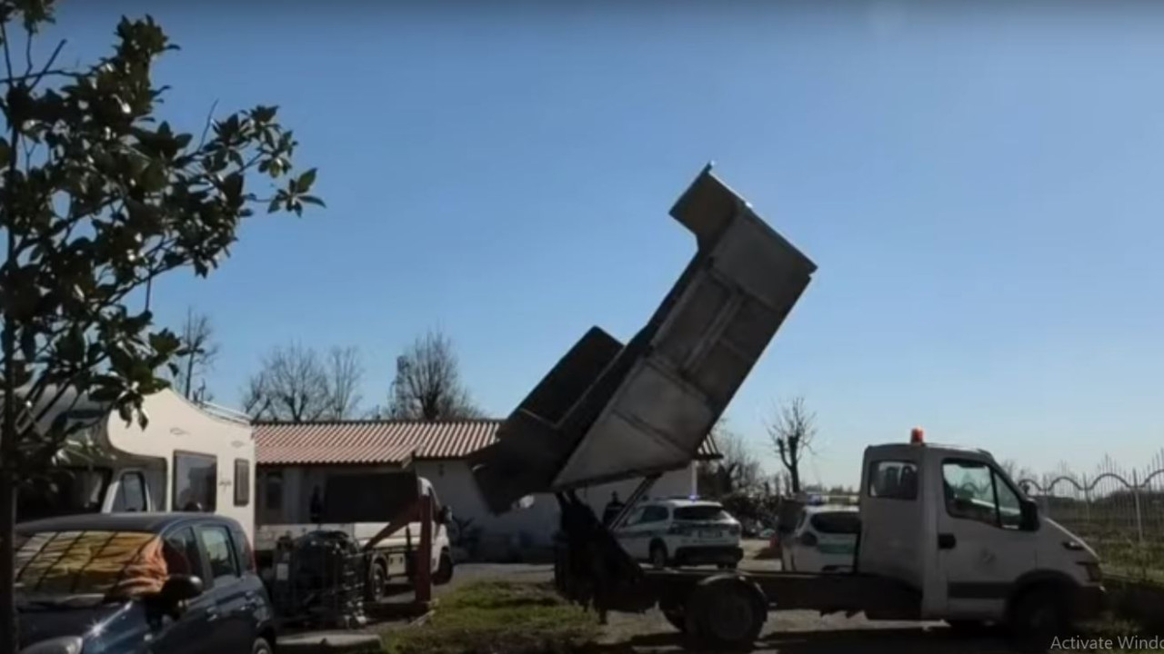 Στα επόμενα πλάνα, ένας μεγάλος κάδος για μπάζα ξεφορτώνει τους δύο καναπέδες στην πρασιά του παραβάτη.