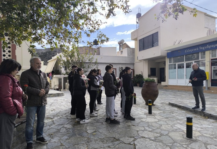 Εκεί οι μαθητές, παρουσία των Αντιδημάρχων κ. Χαράλαμπου Κονδυλάκη και Μανώλη Αγαπουλάκη, του Εντεταλμένου Συμβούλου Παιδείας κ. Θεόδωρου Καρτσάκη και μελών του Δημοτικού Συμβουλίου, κατέθεσαν συμβολικά από ένα κόκκινο τριαντάφυλλο στο Μνημείο, τιμώντας με αυτό τον τρόπο τους ήρωες του Πολυτεχνείου που έδωσαν τη ζωή τους για την Ελευθερία.