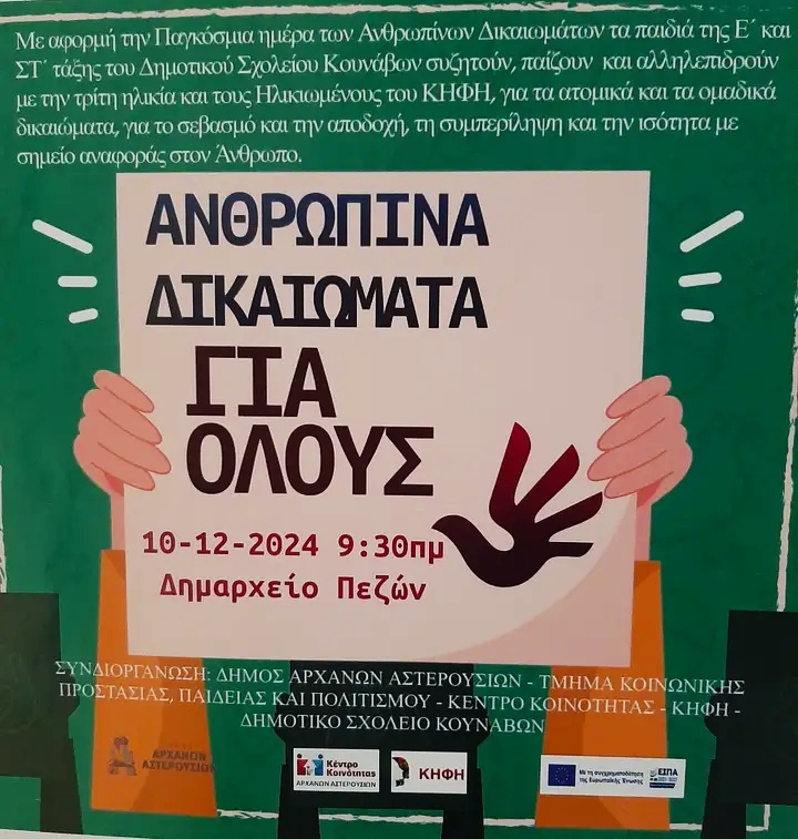 Η εκδήλωση, την οποία συνδιοργάνωσαν η κοινωνική υπηρεσία του Δήμου Αρχανών-Αστερουσίων, το ΚΗΦΗ, το Κέντρο Κοινότητας και το Δημοτικό Σχολείο Κουνάβων έφερε κοντά ανθρώπους της Τρίτης Ηλικίας και παιδιά της Ε΄και ΣΤ΄Δημοτικού, και ήταν αφιερωμένη στην Παγκόσμια Ημέρα Ανθρωπίνων Δικαιωμάτων.