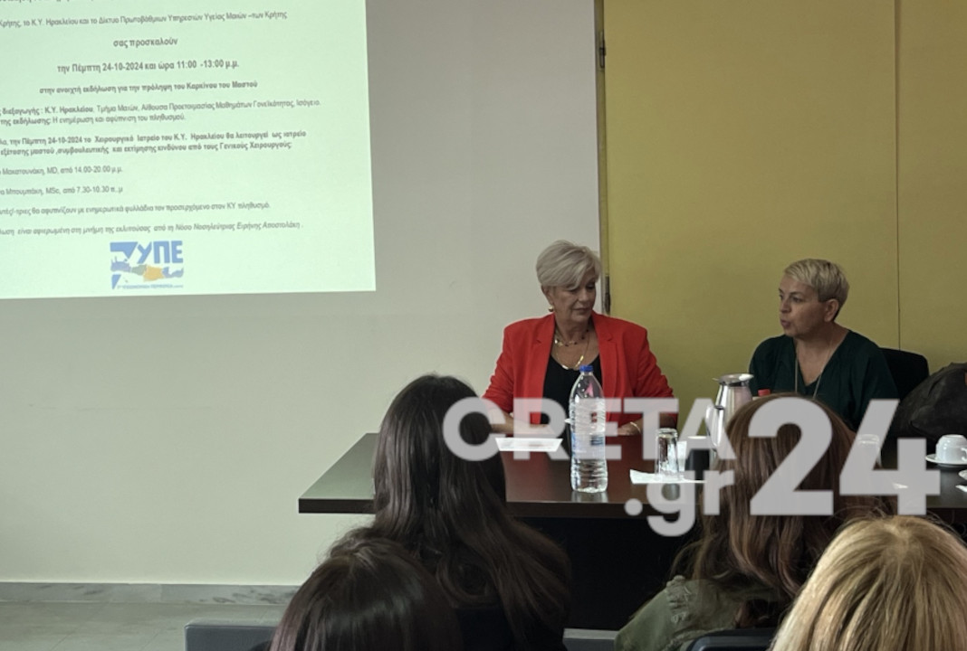 Αξίζει να σημειωθεί πως σήμερα, μέχρι τις 8 το βράδυ, το Χειρουργικό Ιατρείο του Κ.Υ. Ηρακλείου θα λειτουργεί ως ιατρείο κλινικής εξέτασης μαστού ,συμβουλευτικής και εκτίμησης κινδύνου από γενικούς Χειρουργούς.