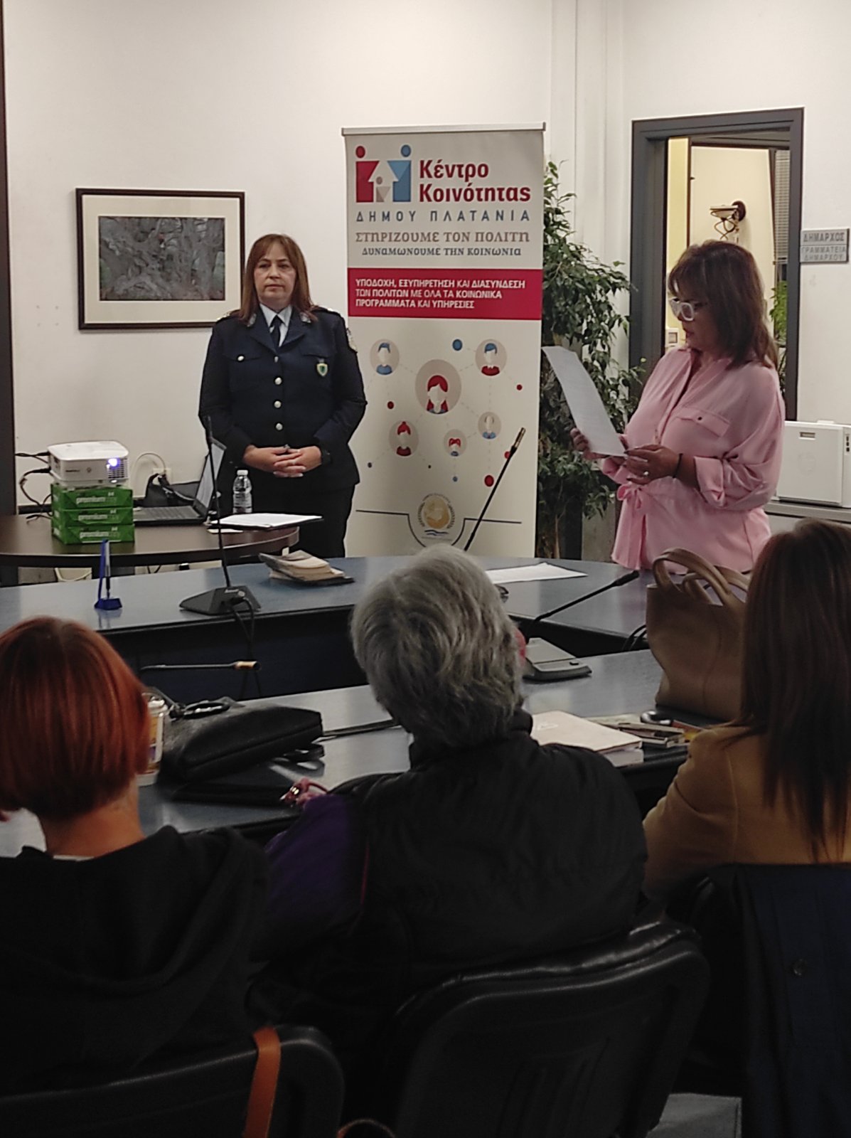 Με επιτυχία πραγματοποιήθηκε τη Δευτέρα 10 Νοεμβρίου 2025 η ομιλία για την ενδοοικογενειακή βία που διοργάνωσε το Κέντρο Κοινότητας Δήμου Πλατανιά σε συνεργασία με την Αστυνομική Διεύθυνση Χανίων και ομιλήτρια την Υπαστυνόμο Α΄ κα Βιγλάκη Ελένη, προϊσταμένη του γραφείου της ενδοοικογενειακής βίας.