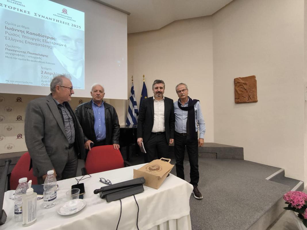 Με επιτυχία ξεκίνησε ο νέος κύκλος ομιλιών και παρουσιάσεων της επιτυχημένης δράσης “ΙΣΤΟΡΙΚΕΣ ΣΥΝΑΝΤΗΣΕΙΣ”, που διοργανώνει ο Δήμος Πλατανιά , σε συνεργασία με την Ορθόδοξο Ακαδημία Κρήτης και την υποστήριξη της Ομάδας Φιλίστορων Δήμου Πλατανιά. Συγκεκριμένα, την Τετάρτη 2 Απριλίου πραγματοποιήθηκε η ομιλία με θέμα : “Ιωάννης Καποδίστριας: Ρώσος Υπουργός Εξωτερικών ή Έλληνας Επαναστάτης;” στο αμφιθέατρο της ΟΑΚ, στο Κολυμπάρι, από τον κ. Παναγιώτη Πασπαλιάρη, συγγραφέα-ιστορικό. Ο ομιλητής αναφέρθηκε, μέσα από μαρτυρίες και ιστορικά , άγνωστα σε πολλούς, ιστορικά γεγονότα, στο έργο και στην προσωπικότητα του Ιωάννη Καποδίστρια καθώς και στο ιστορικό πλαίσιο μέσα στο οποίο έζησε και δραστηριοποιήθηκε.