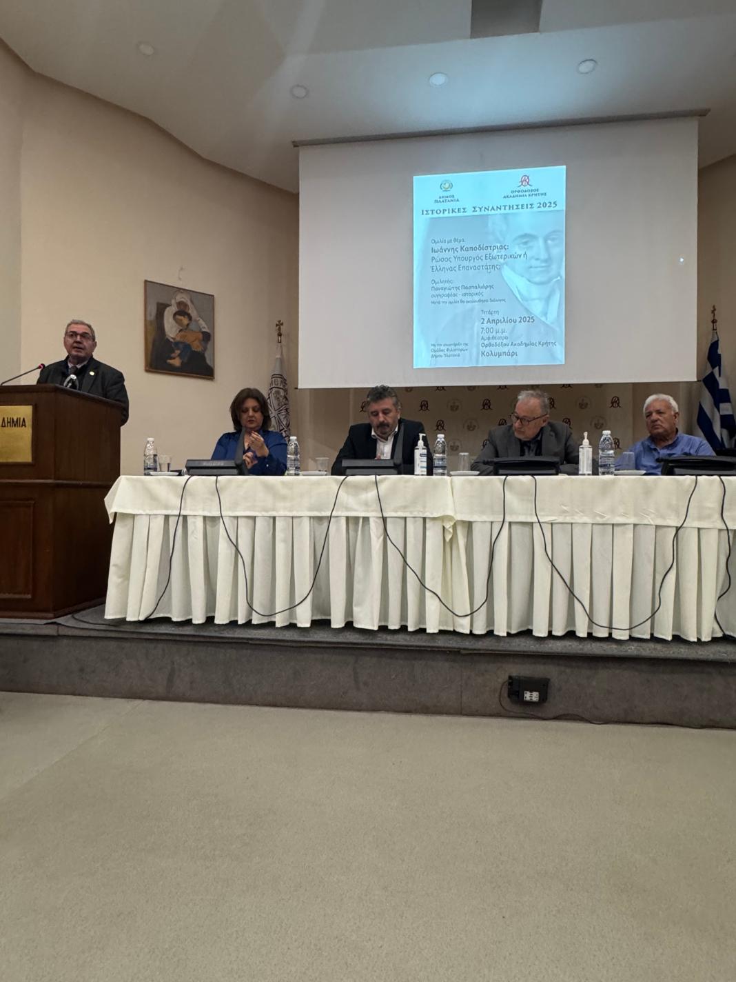 Με επιτυχία ξεκίνησε ο νέος κύκλος ομιλιών και παρουσιάσεων της επιτυχημένης δράσης “ΙΣΤΟΡΙΚΕΣ ΣΥΝΑΝΤΗΣΕΙΣ”, που διοργανώνει ο Δήμος Πλατανιά , σε συνεργασία με την Ορθόδοξο Ακαδημία Κρήτης και την υποστήριξη της Ομάδας Φιλίστορων Δήμου Πλατανιά. Συγκεκριμένα, την Τετάρτη 2 Απριλίου πραγματοποιήθηκε η ομιλία με θέμα : “Ιωάννης Καποδίστριας: Ρώσος Υπουργός Εξωτερικών ή Έλληνας Επαναστάτης;” στο αμφιθέατρο της ΟΑΚ, στο Κολυμπάρι, από τον κ. Παναγιώτη Πασπαλιάρη, συγγραφέα-ιστορικό. Ο ομιλητής αναφέρθηκε, μέσα από μαρτυρίες και ιστορικά , άγνωστα σε πολλούς, ιστορικά γεγονότα, στο έργο και στην προσωπικότητα του Ιωάννη Καποδίστρια καθώς και στο ιστορικό πλαίσιο μέσα στο οποίο έζησε και δραστηριοποιήθηκε.