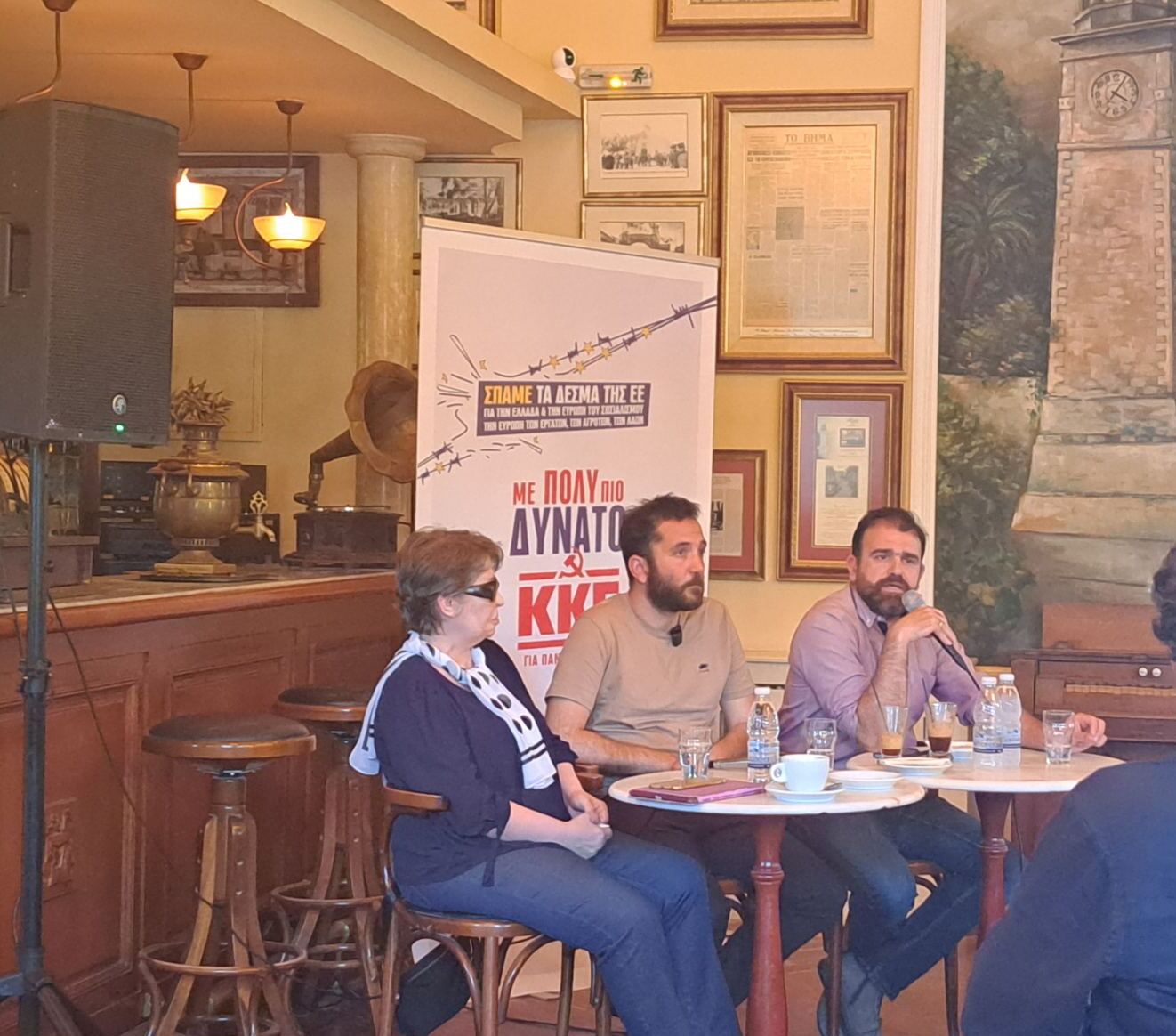 Παίρνοντας τον λόγο ο Γ. Στεφανάκης αναφέρθηκε στην κριτική που ασκείται στο ΚΚΕ ότι ενώ διαφωνεί με την ΕΕ, συμμετέχει στις Ευρωεκλογές. “Δε θα τους κάνουμε τη χάρη φίλες και φίλοι να μην συμμετέχουμε στις εκλογές. Παντού σε όλους τους χώρους δουλειάς ένας μεγάλος αριθμός εργαζομένων, αγροτών, αυτοαπασχολούμενων απεχθάνεται την πολιτική της ΕΕ, γιατί λοιπόν να μην εκφραστεί στις εκλογές; και γιατί ο λαός να μην ξέρει την επόμενη μέρα τι θα του ξημερώσει με τα μέτρα που αποφασίζονται εκεί; Το ΚΚΕ ήταν αυτό και κανείς άλλος, που αποκάλυψε τα 600 αντιλαϊκά προαπαιτούμενα για την εκταμίευση του ποσού του ταμείου Ανάκαμψης”. Επεσήμανε ότι “πολύς κόσμος συμφωνεί με όσα υποστηρίζει το ΚΚΕ για την ΕΕ και αναγνωρίζει την συνέπειά του. Αλλά αυτό δεν φτάνει. Στην παρούσα στγμή θα πρέπει ο καθένας ανάλογα με το βαθμό της συμφωνίας του με το ΚΚΕ να πάρει την απόφασή του να το στηρίξει, κρατώντας τις πιθανές διαφωνίες του, ώστε να μην βγούν αλώβητα για άλλη μια φορά τα κόμματα που υποστηρίζουν την άδικη, εγκληματική πολιτική των λόμπυς”. Επεσήμανε ότι οι ισχυρισμοί ΣΥΡΙΖΑ και ΠΑΣΟΚ ότι στην Ελλάδα δεν εφαρμόζεται η πολιτική της ΕΕ γι’ αυτό έχουμε χαμηλούς μισθούς, γκρεμίζεται από τους ίδιους τους εργαζόμενους της Ευρώπης: “αν ήταν ετσι γιατί οι εργαζόμενοι στην Γαλλία πλημμύρισαν την Βαστίλη ζητώντας αυξήσεις, αν ήταν έτσι γιατί ξεσηκώθηκαν οι αγρότες στις Βρυξέλλες, οι εργαζόμενοι στην Ισπανία, στην Ιταλία, στην Αγγλία ακόμα και στην Γερμανία που πραγματοποίησαν τις μεγαλύτερς διαδηλώσεις των τελευταίων ετών;” αναρωτήθηκε. Τέλος πρόσθεσε ότι “κρητήριο ψήφου είναι και η εμπλοκή της χώρας σε δύο πολέμους: όποιος θέλει να ψηφίσει για την Ειρήνη, να ψηφίσει αντι-νατοϊκά”, είπε, “πρέπει να στείλει το μήνυμα ενισχύοντας το ΚΚΕ”.
