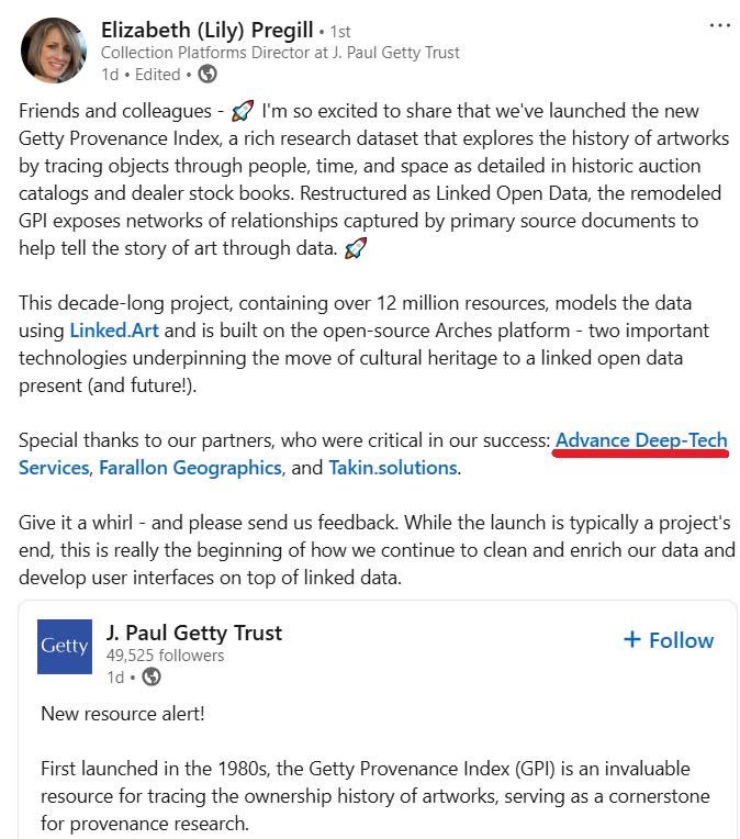 «Χθες (σ.σ. Παρασκευή 2/5/25) ήταν μεγάλη μέρα για την εταιρία μας Advance Deep-tech Services καθώς το Getty Institute, το μεγαλύτερο ερευνητικό κέντρο παγκοσμίως που εδρεύει στην Καλιφόρνια, δημοσίευσε την ανανεωμένη βάση δεδομενων τους (περισσότερες απο 12.000.000 εγγραφές) σχετικά με την ιστορία της τέχνης.