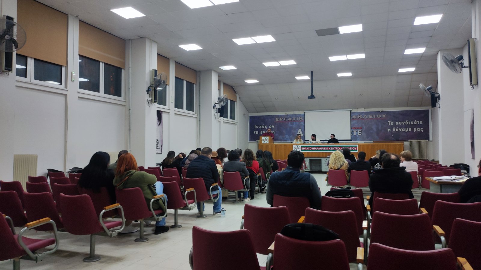 …Δεν υπάρχει άλλη επιλογή για μας από το να οργανώσουμε μία μαζική δυναμική απεργιακή μάχη την Τετάρτη 28 Φλεβάρη και στο Ηράκλειο. Να βρωντοφωνάξουμε πως στο δίλημμα τα κέρδη τους ή οι ζωές μας εμείς απαντάμε οι ζωές μας και το κάνουμε πράξη μέσα από τους αγώνες μας!»